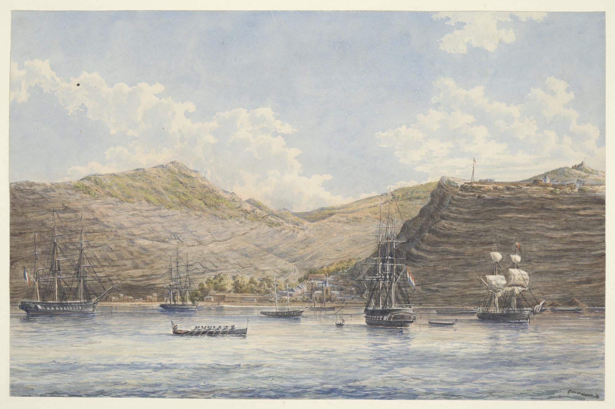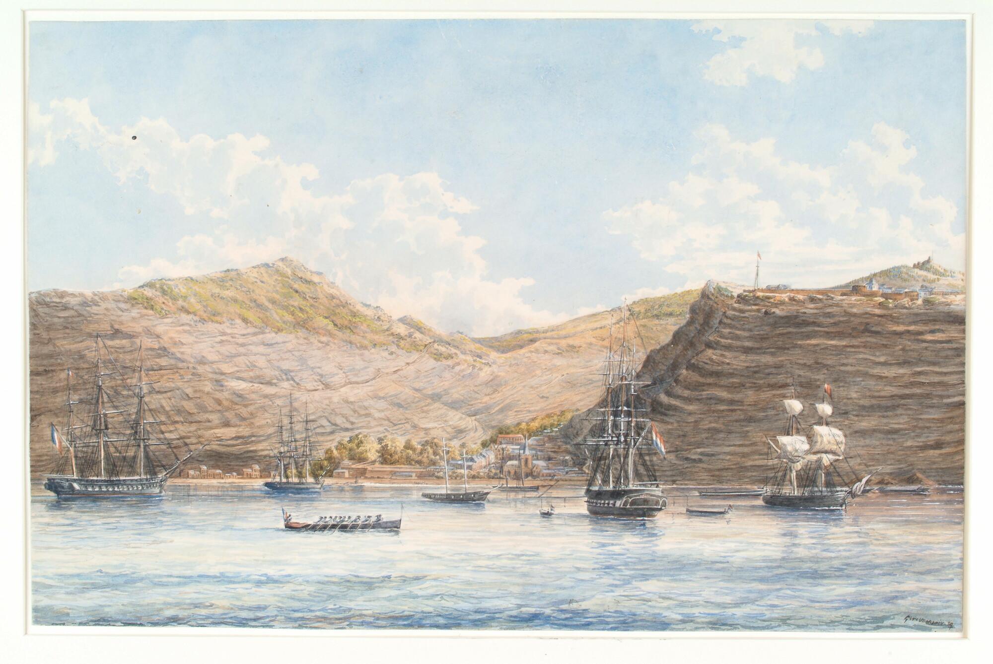 De rede van St. Helena met Jamestown, linkerdeel van een panorama, bestaande uit drietekeningen. Op de rede twee Nederlandse oorlogsschepen en een zevenriems-sloep.
