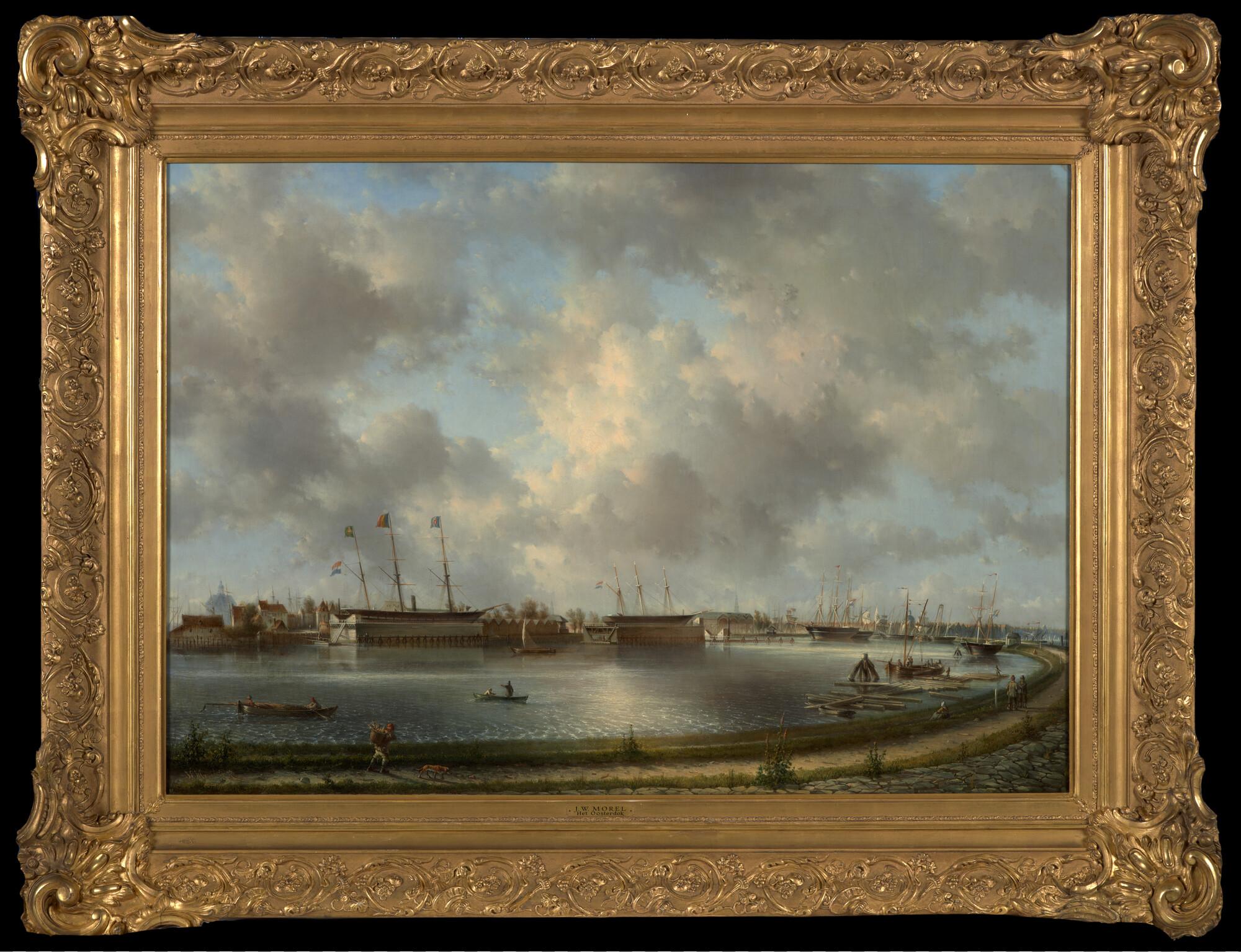 Schilderij in lijst van gezicht op het Oosterdok en de Rijkswerf te Amsterdam, vanaf de Oosterdoksdam, met helemaal links de Oosterkerk. Bij de Rijkswerf twee drijvende droogdokken.