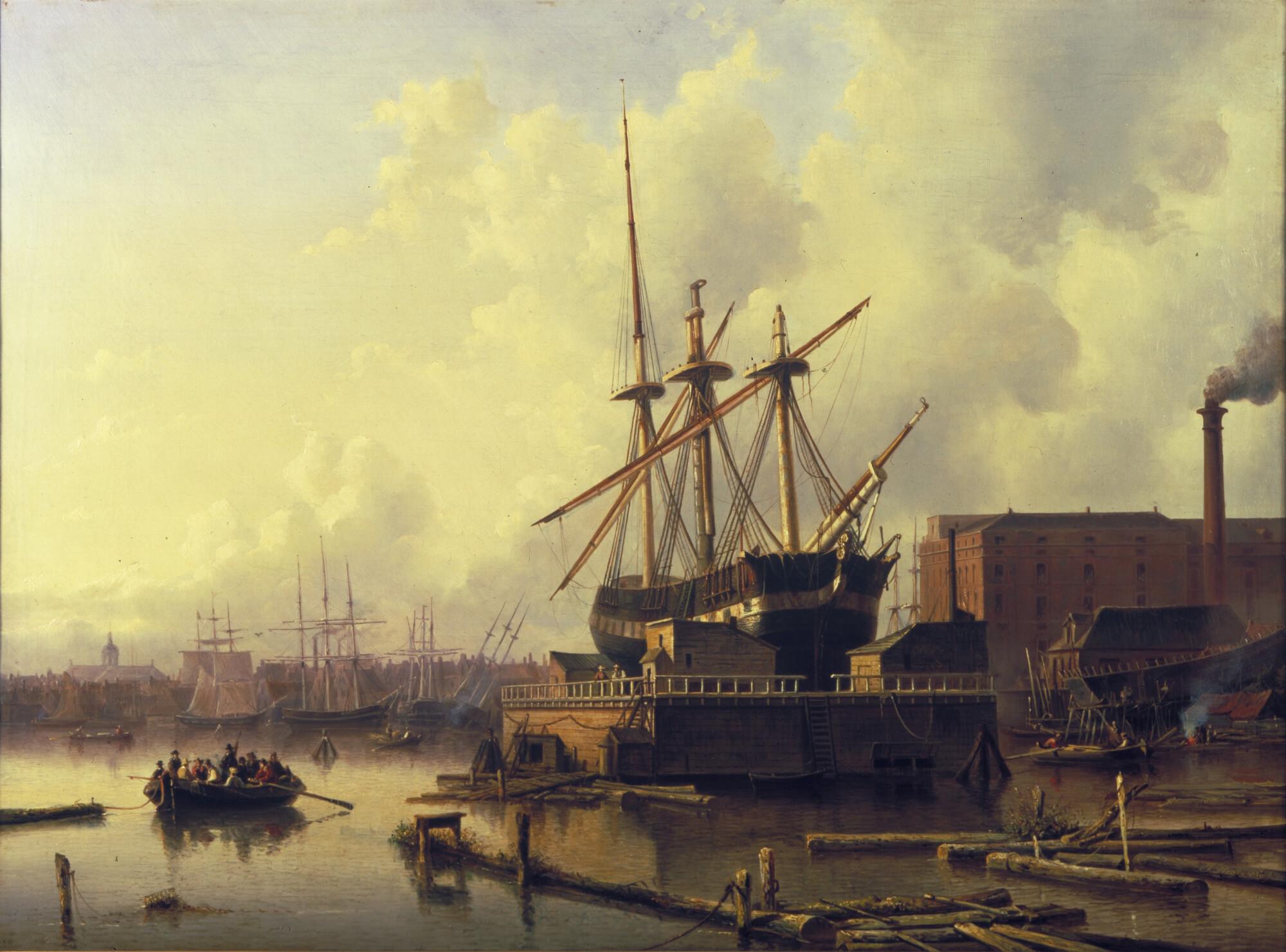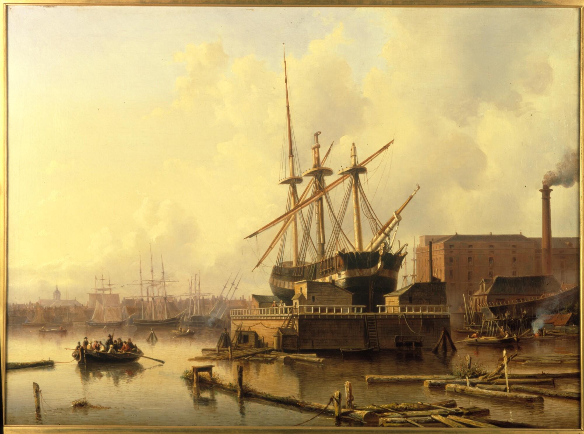 Gezicht op het Westerdok en het Bickerseiland te Amsterdam; rechts de suikerfabriek 'Java' aan de Zandhoek (afgebrand in 1874).