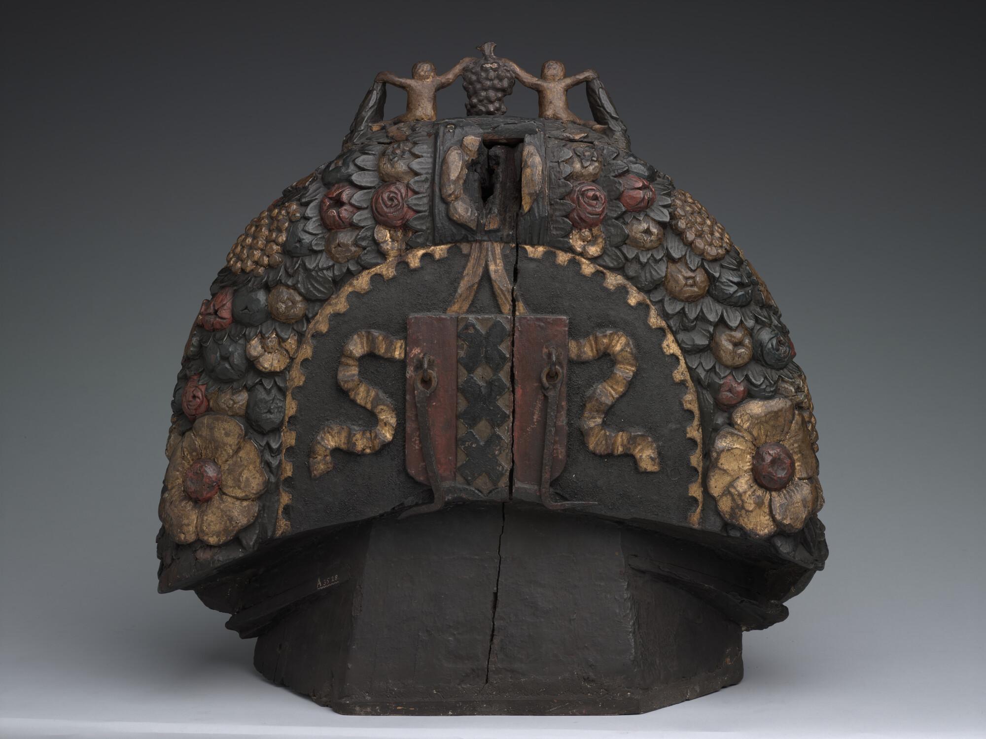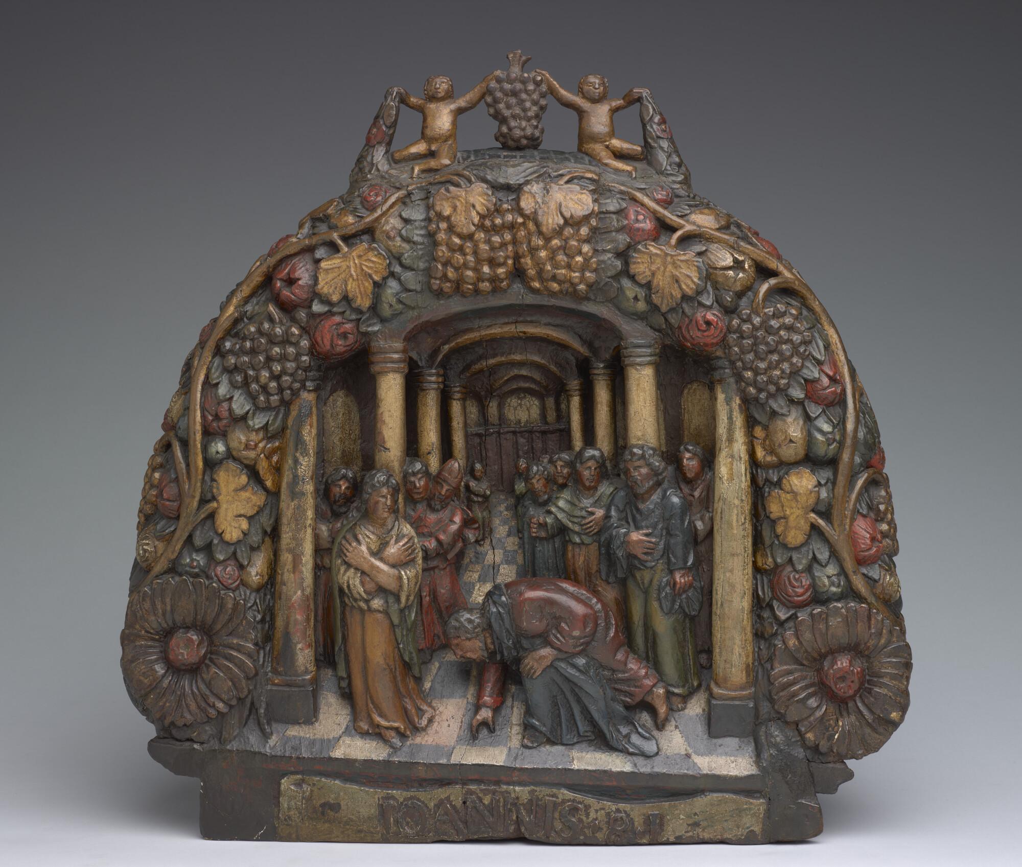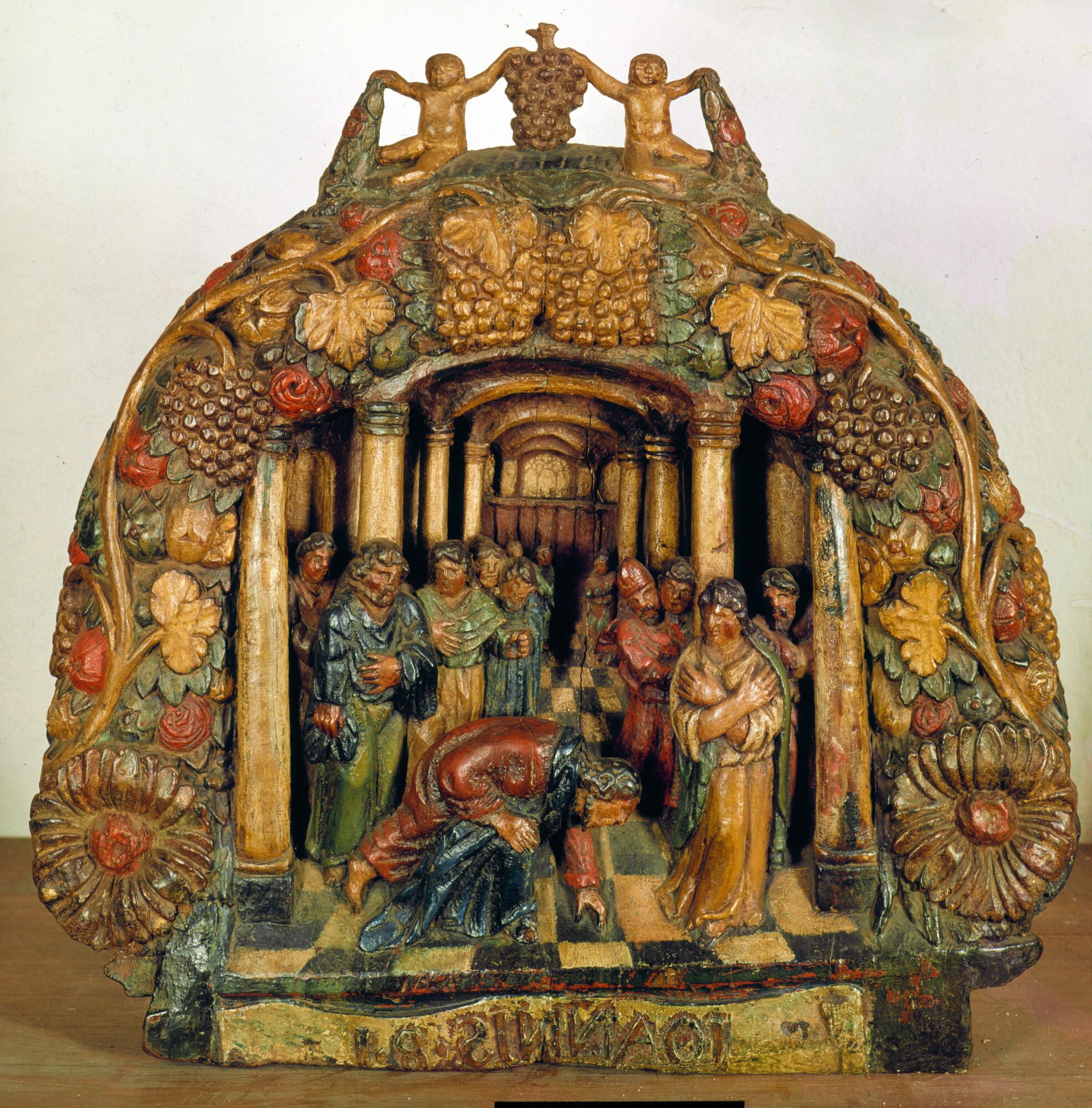 Hakkebord met aan de voorkant een in prachtig perspectief uitgesneden bijbels tafereel voorstellend 'Christus en de overspelige vrouw'.