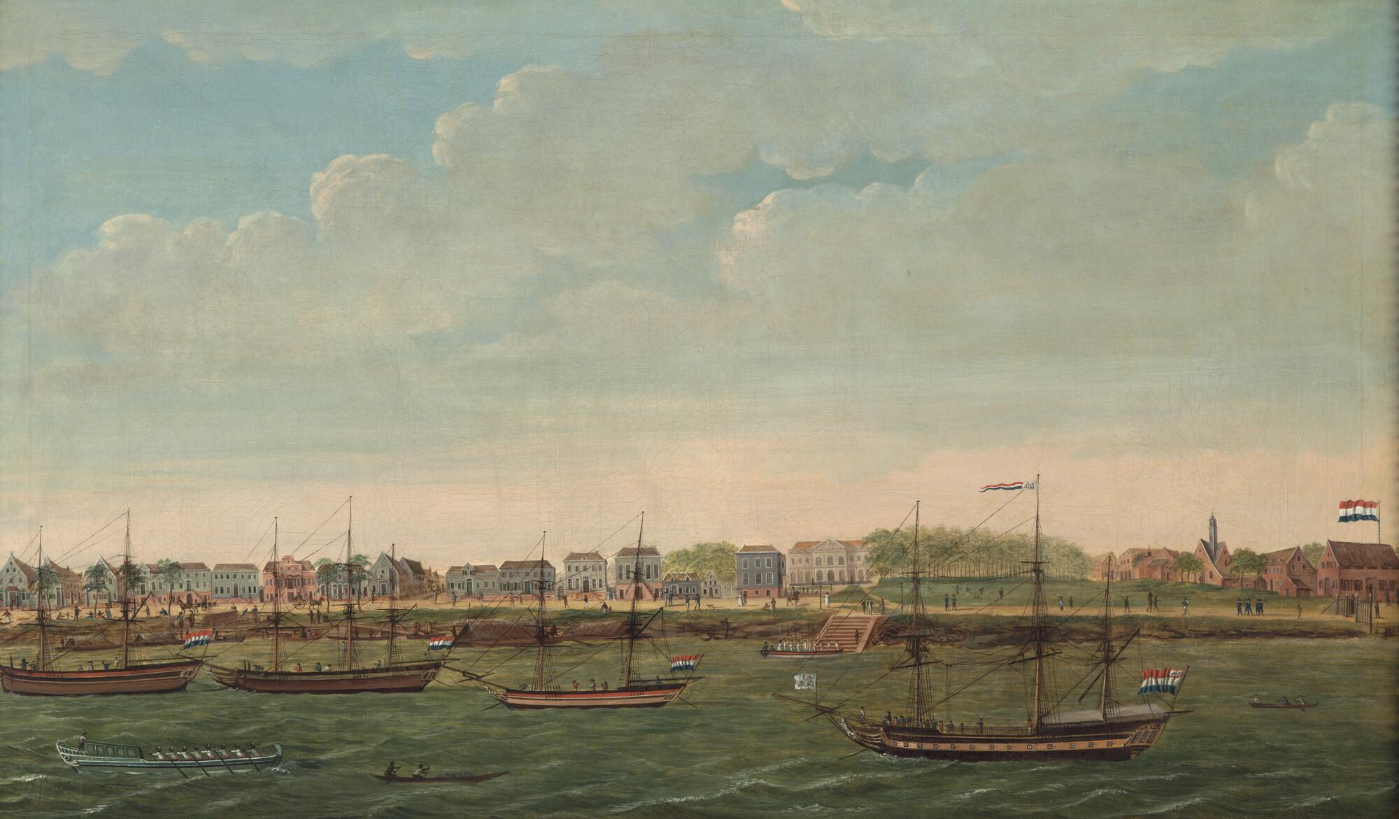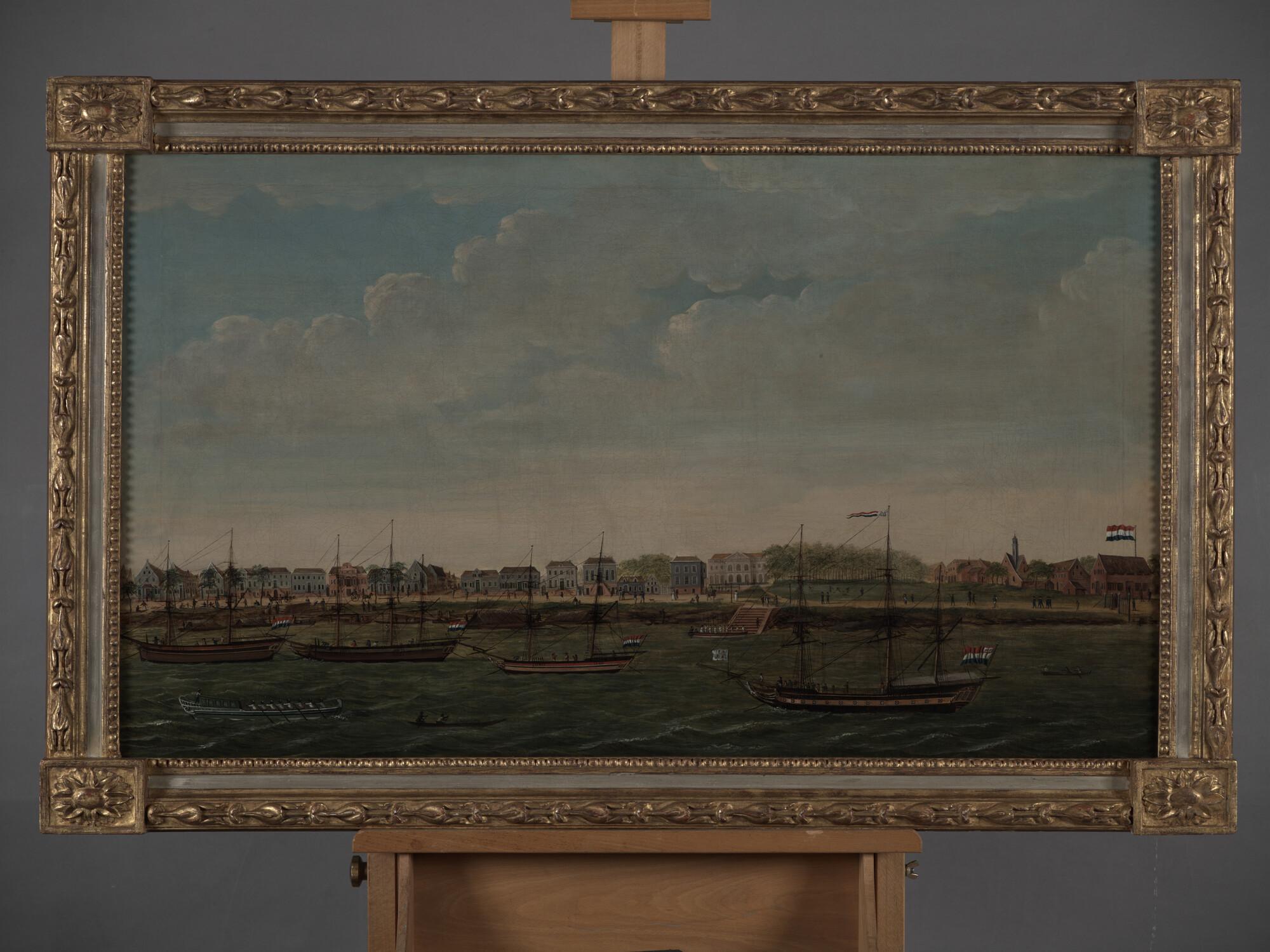 Het fregat Vertrouwen onder commando van kapitein-ter-zee P. Hartsinck en drie Nederlandse koopvaarders voor anker aan de Waterkant. De Waterkant was de rede van Paramaribo. In lijst.