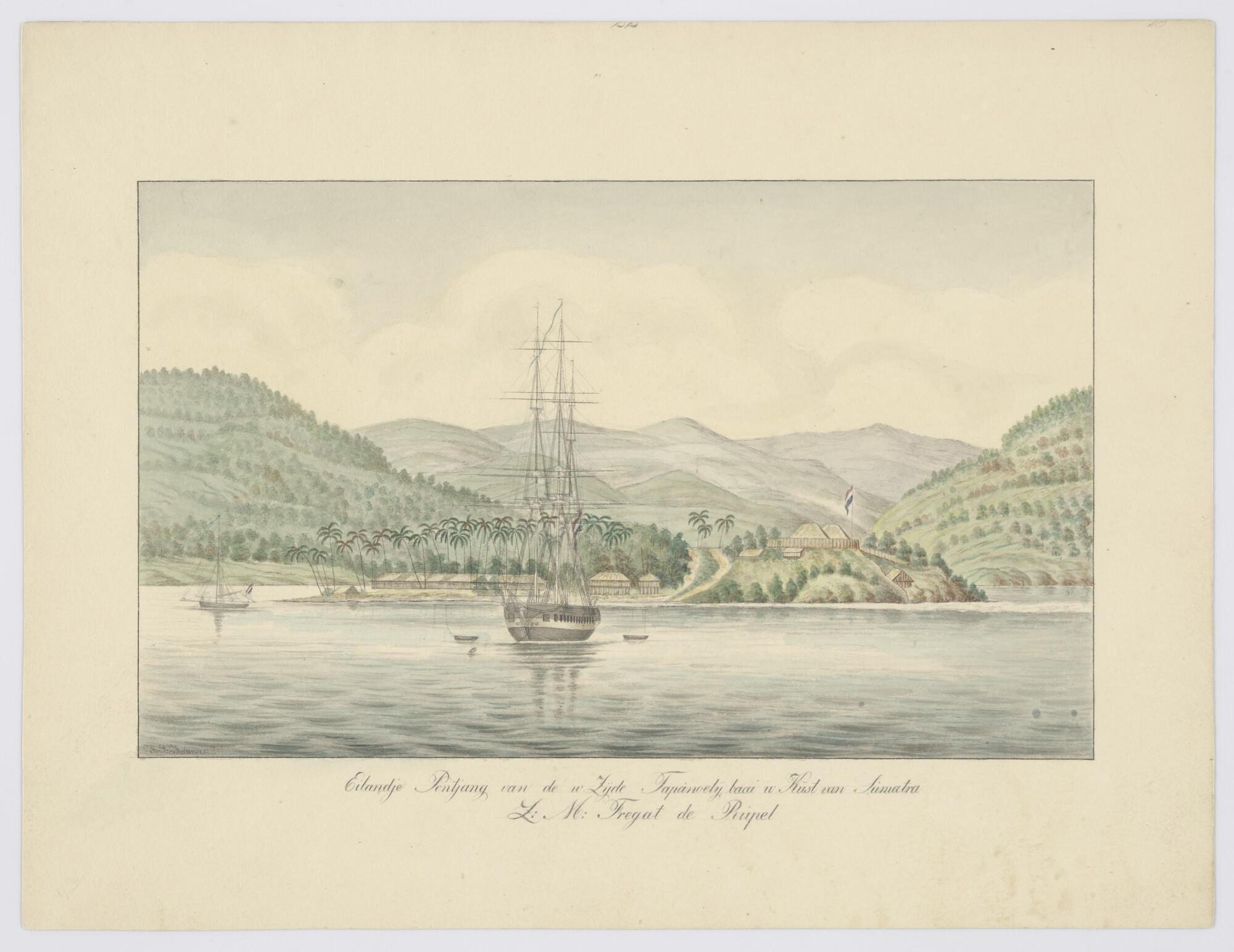Het fregat Zr.Ms. "Rupel" bij het eilandje Pontjang in de Tapanoelijbaai aan de westkust van Sumatra.