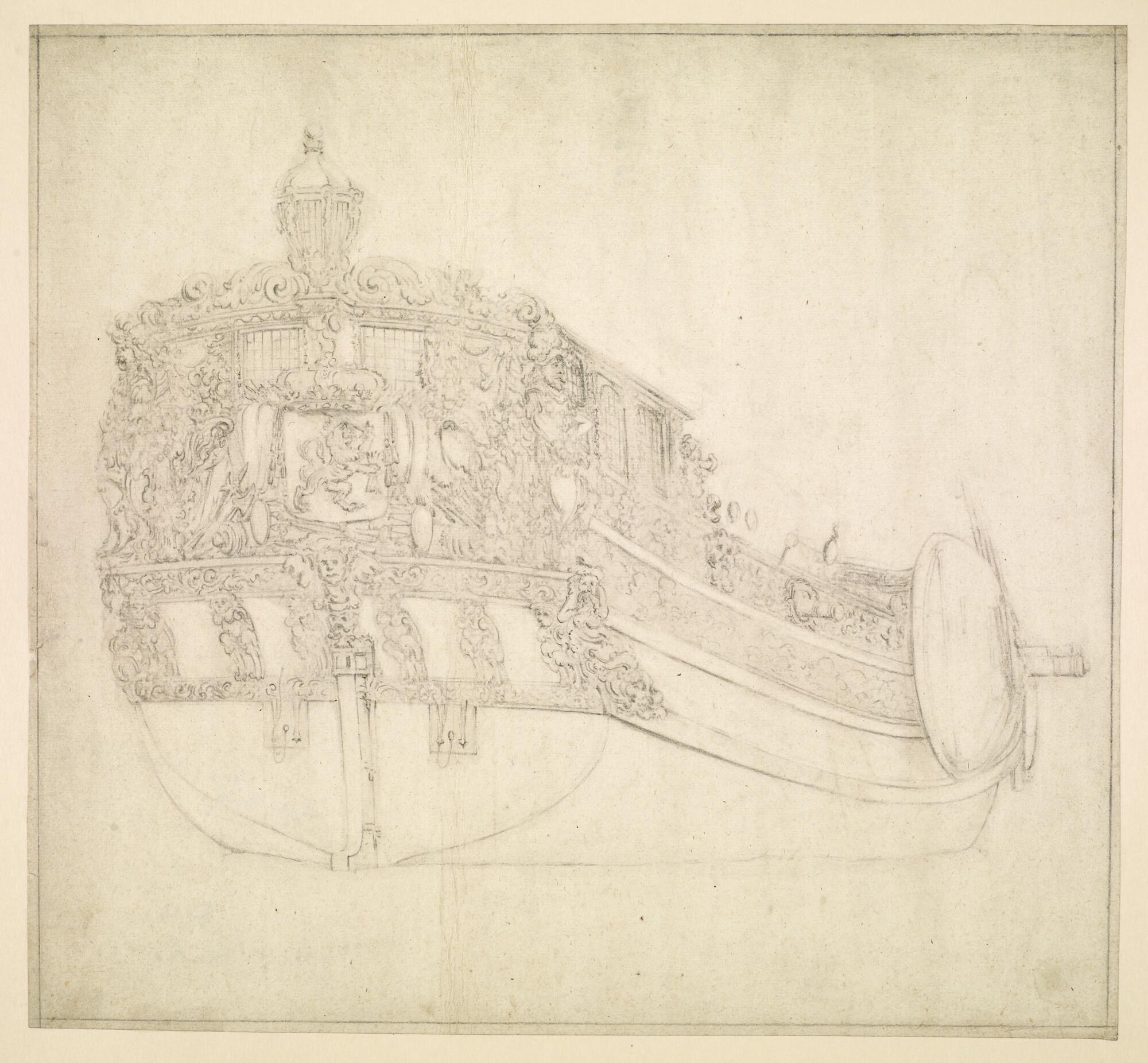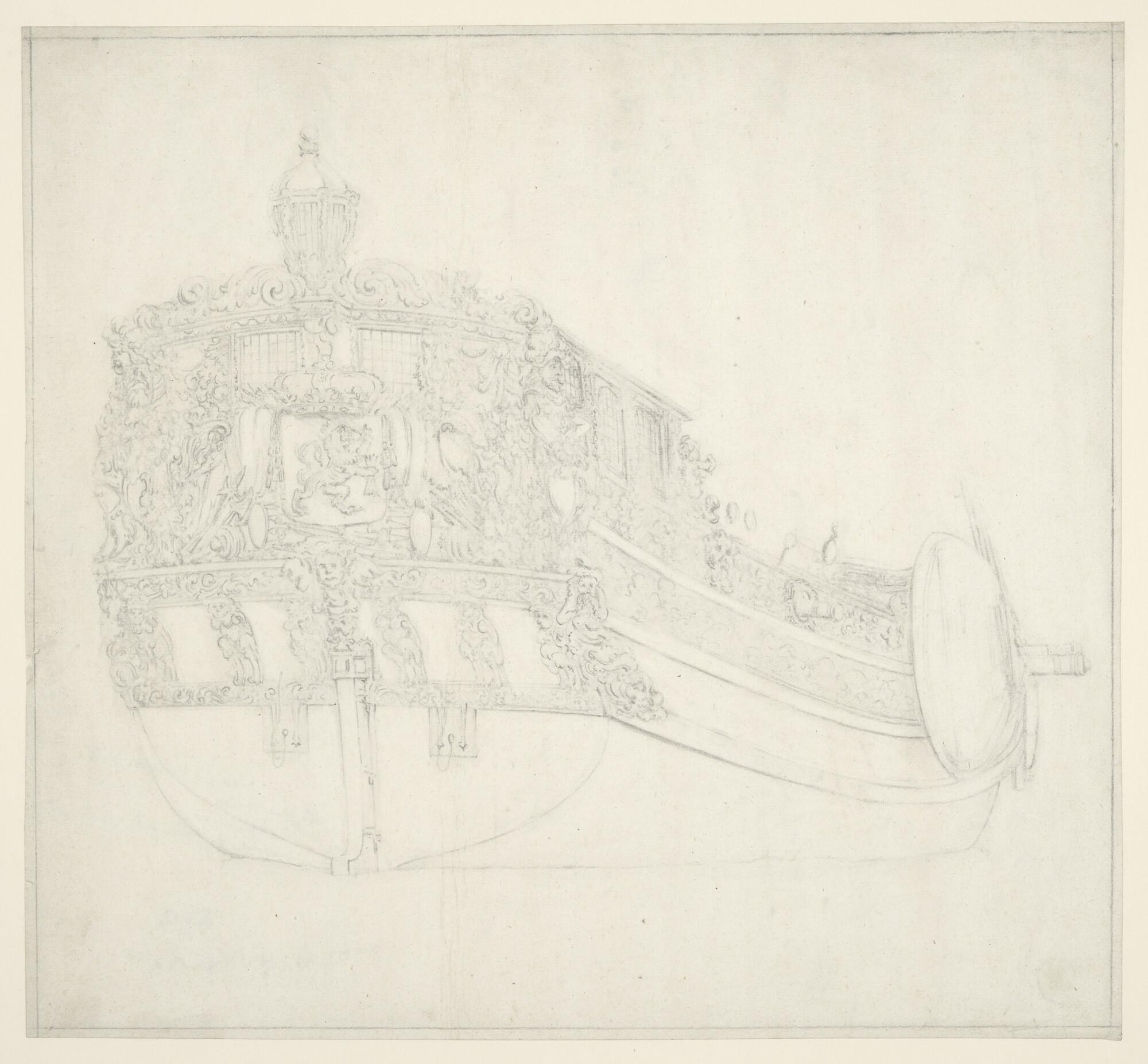 Een spiegelpaviljoenjacht van de Staten-Generaal; stuurboord-achteraanzicht.