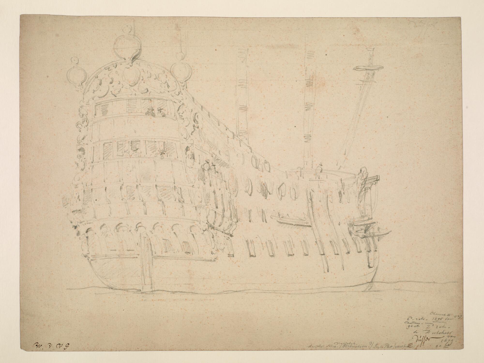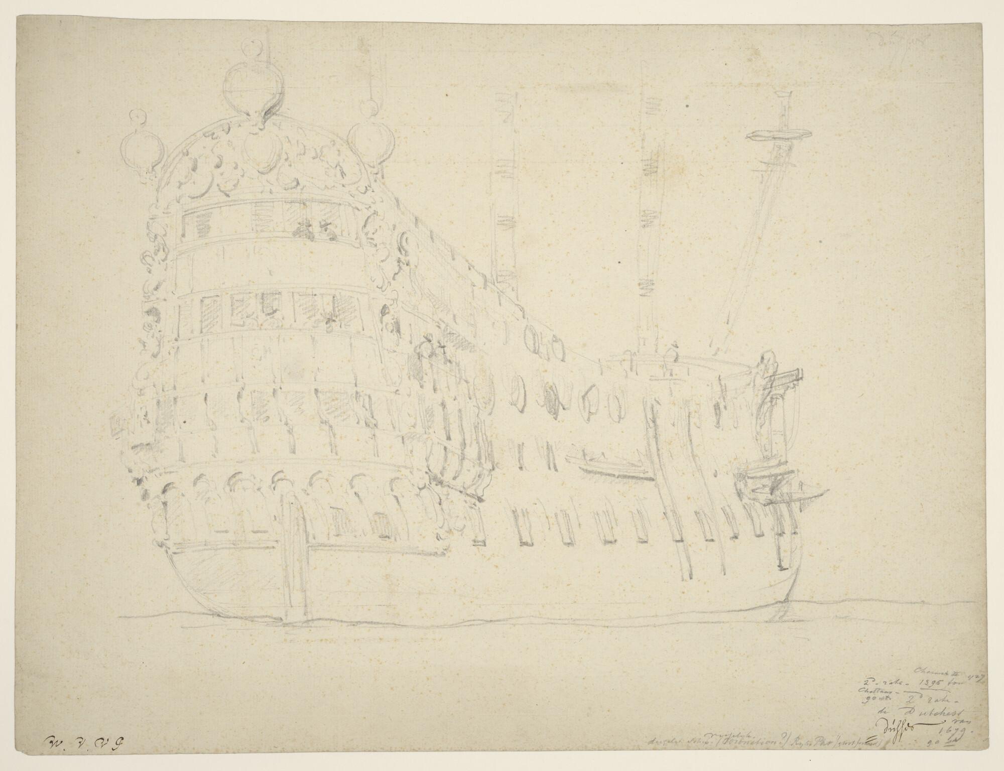 Het Engelse oorlogsschip Duchess, stuurboord-achteraanzicht.