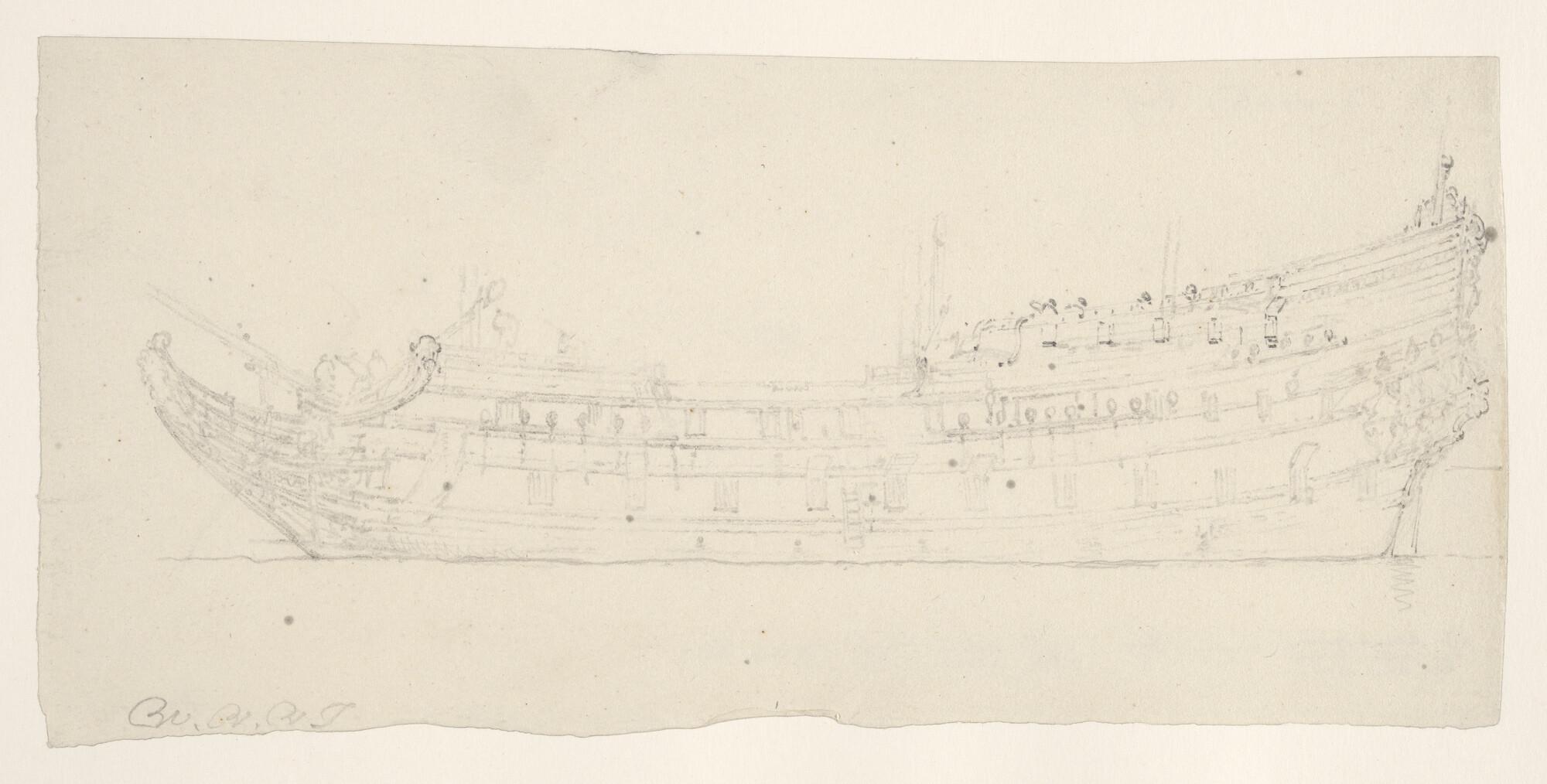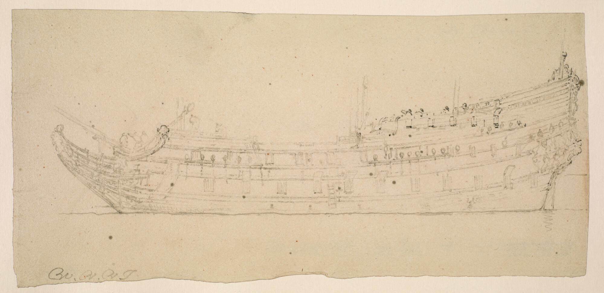 Het oorlogsschip De Wakende Boei, opgewerkte tekening op tegendruk.