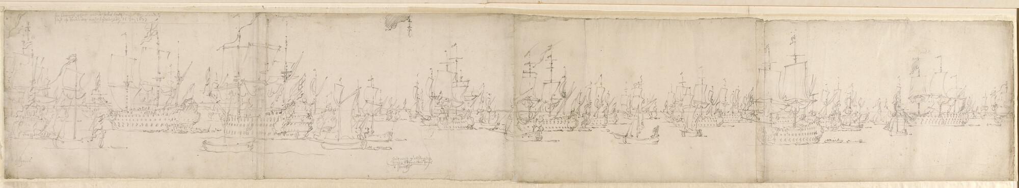 De Engelse vloot op de Theems op de dag na de tweede Slag bij Schooneveld, 15 juni 1673; tekening gemaakt vanaf de "Royal Prince" (schematisch aangeduid op het tweede blad van links), het vlaggenschip van Sir Edward Spragge, admiraal van het blauwe eskader. Te zien zijn ca. 25 oorlogsschepen en een groot aantal kleine schepen ...
