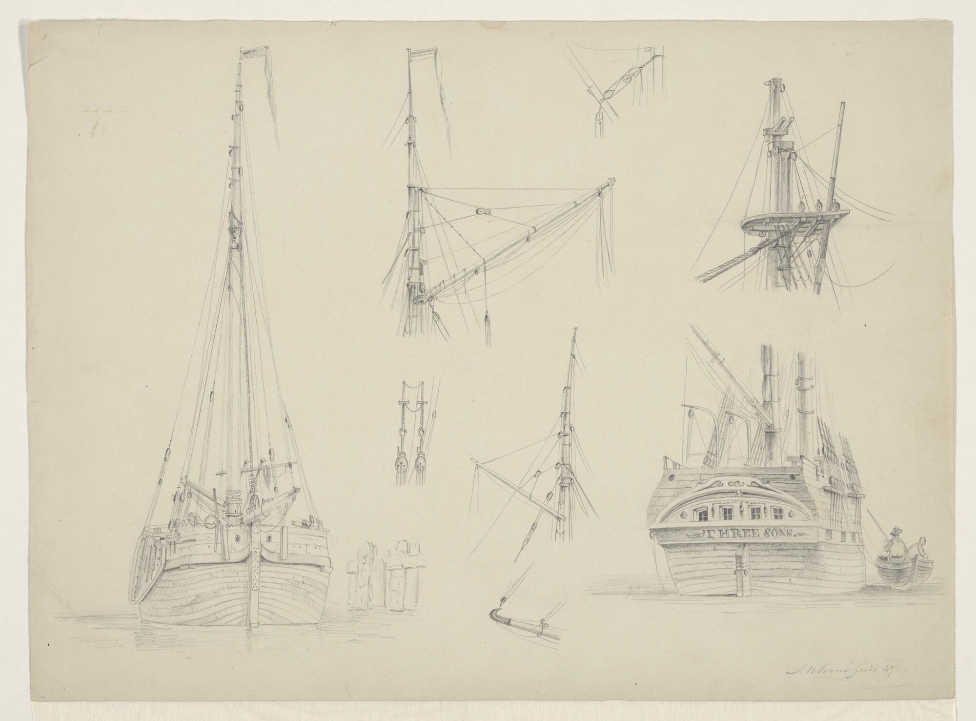 Voor- en achteraanzichten van diverse zee- en binnenschepen.