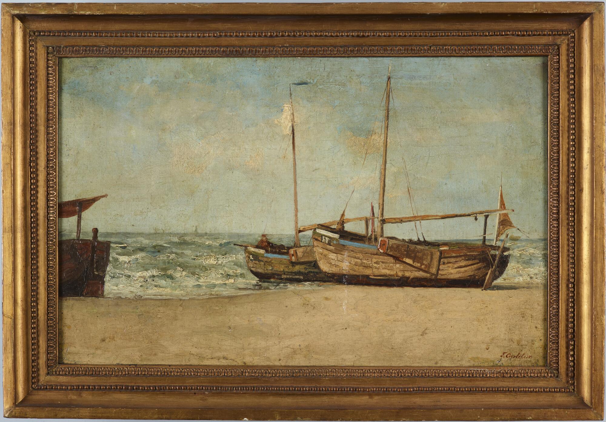 Drie Katwijker bomschepen op het strand, omstreeks 1890.