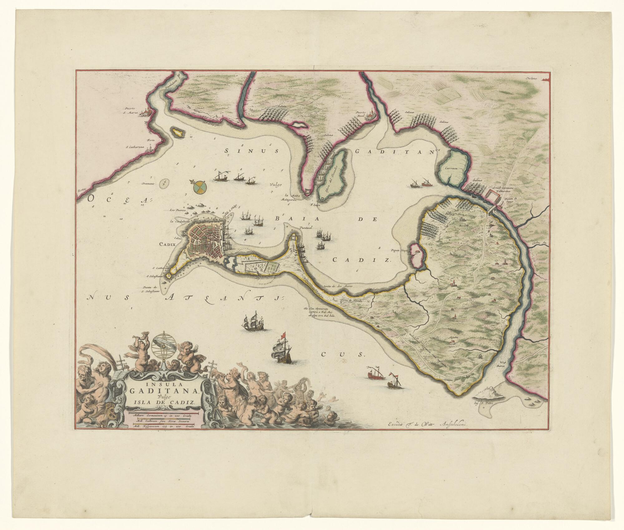 Met de hand gekleurde kaart van het eiland van Cadiz, Spanje. Uitgave Frederick de Wit (1610-1698), Amsterdam, circa 1690.