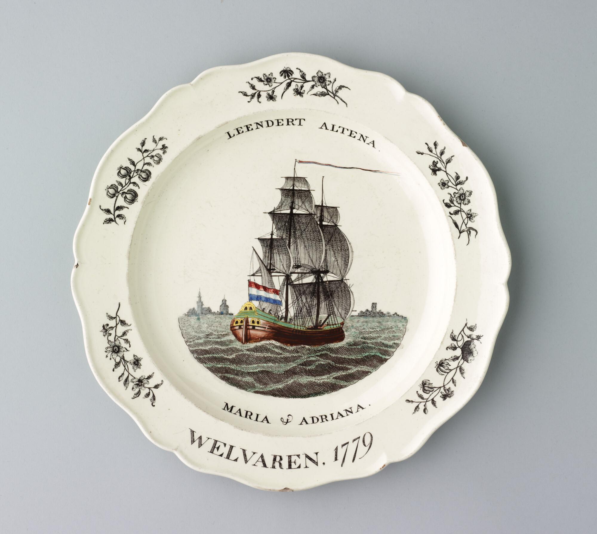 Bord met geschulpte rand van Engels aardewerk. Gedecoreerd met een hoeker met op de achtergrond een dorpsgezicht. Boven de voorstelling het opschrift "Leendert Altena" en eronder de naam van het schip "Maria & Adriana".