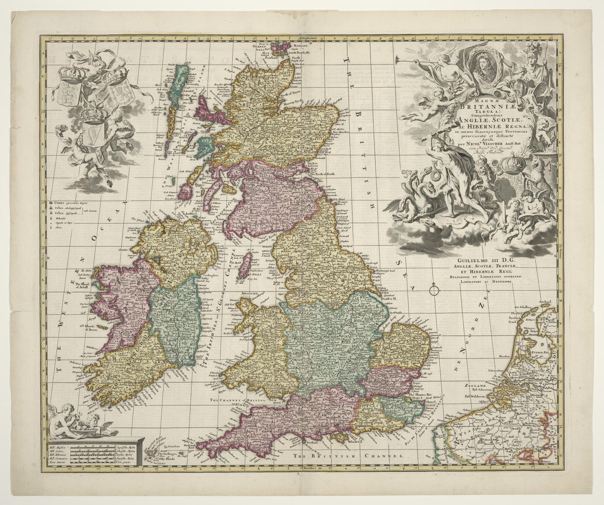 Met de hand gekleurde kaart van Groot-Brittanië, door Nicolaas Jansz Visscher (1649 - 1702), Amsterdam, circa 1698. Opgedragen aan Stadhouder-Koning Willem III. Met privilege van de Staten Generaal (schaal 1 op 2.500.000).