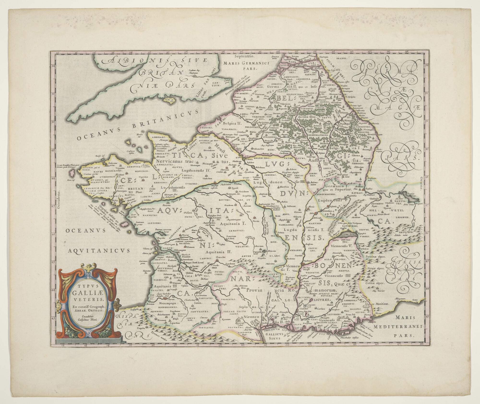 Met de hand gekleurde kaart van Frankrijk naar Abraham Ortelius uit 1594. Uitgave Willem Jansz. Blaeu, Amsterdam, circa 1635 (schaal 1 op 3.700.000).
