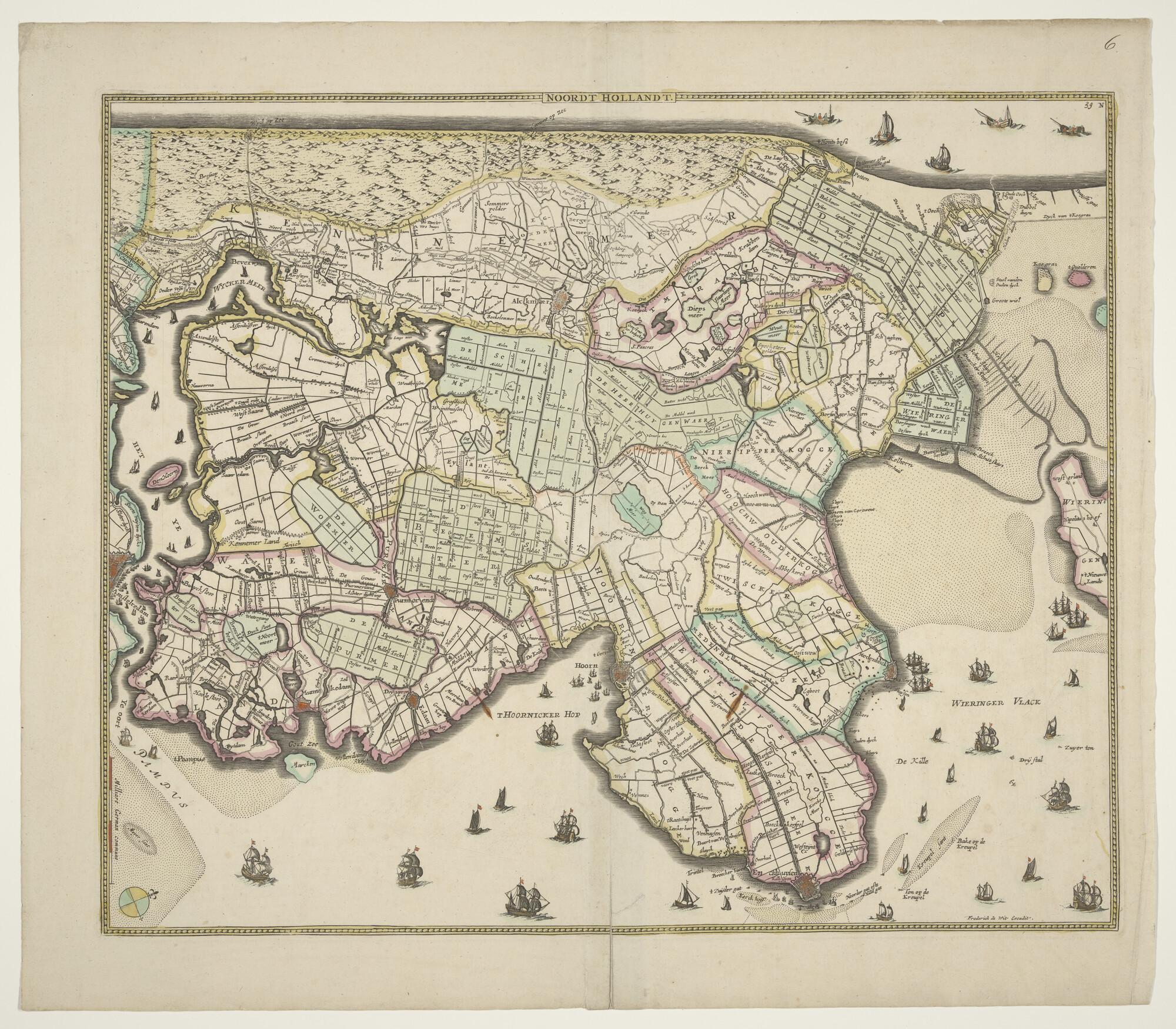 Met de hand gekleurde kaart van Noord-Holland door Frederik de Wit (1610-1698), Amsterdam, circa 1680 (schaal 1 op 100.000).