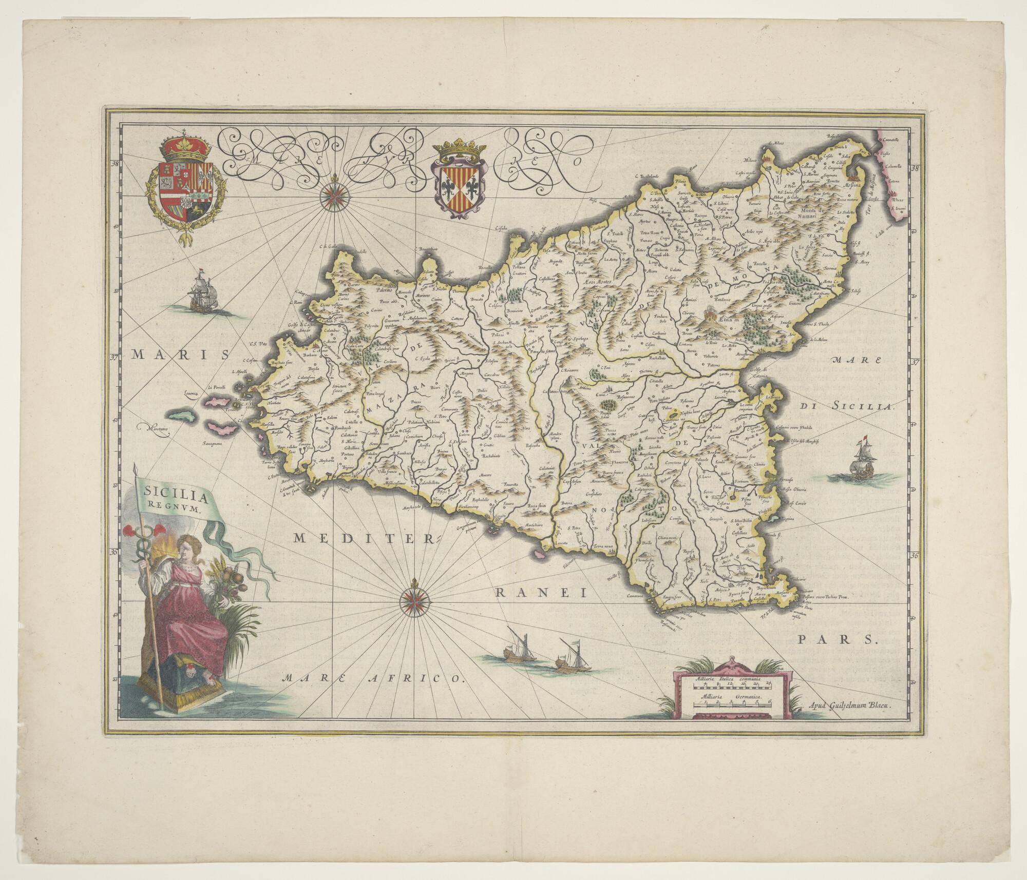 Met de hand gekleurde kaart van Sicilië, door Willem Jansz. Blaeu, Amsterdam, circa 1635 (schaal 1 op 900.000).