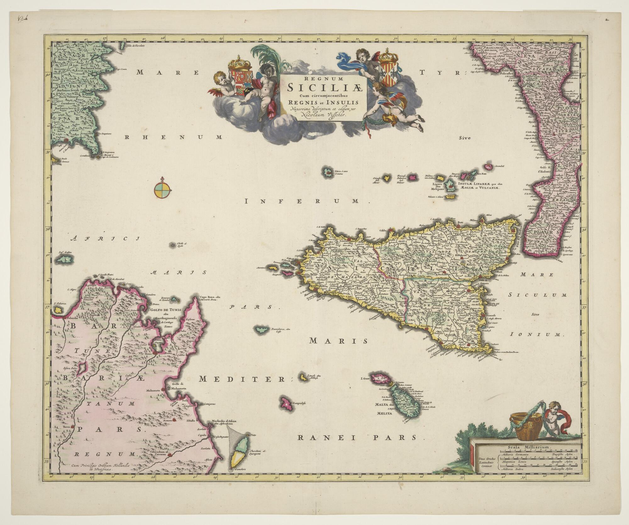 Met de hand gekleurde kaart van Sicilie, door Nicolaas Jansz Visscher (1649 - 1702), Amsterdam, circa 1698. Met privilege van de Staten van Holland en West-Friesland (schaal 1 op 1.400.000).