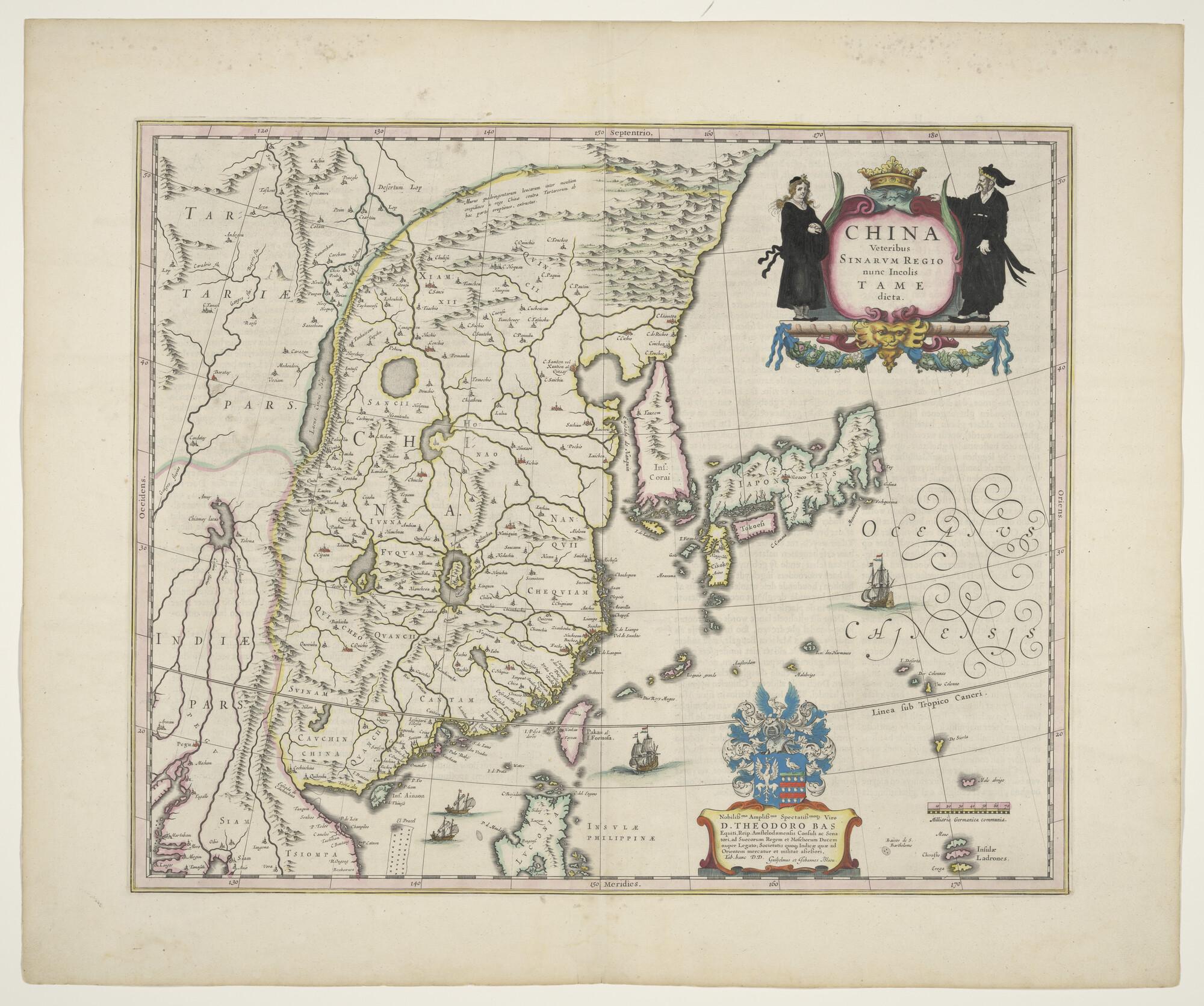 Met de hand gekleurde kaart van China, opgedragen aan Theodorus Bas, door Willem Jansz en Johan Blaeu, Amsterdam, circa 1635 (schaal 1 op 11.500.000).