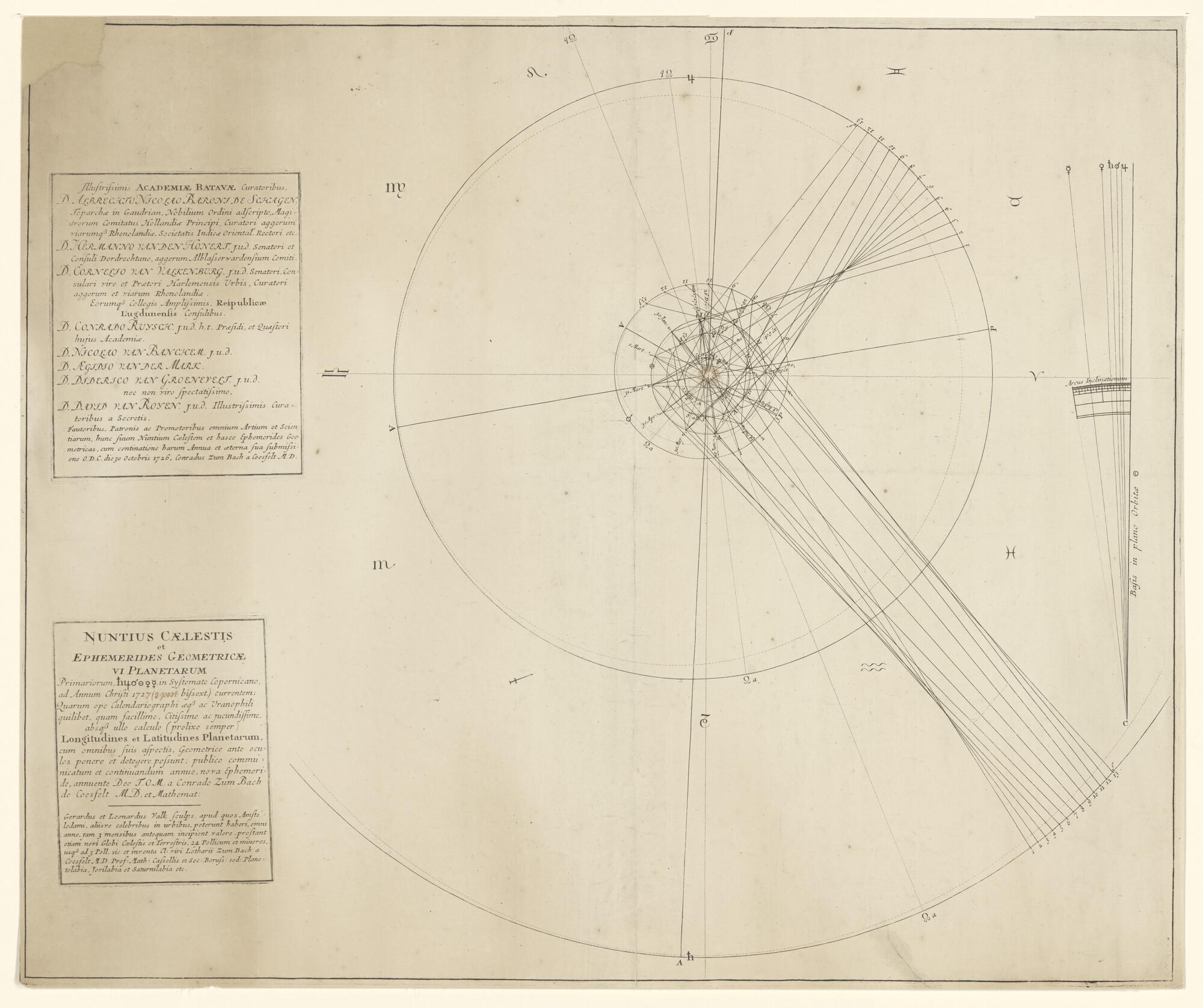 Kaart met de banen van zes planeten rond de zon volgens het Copernikaanse stelsel, door Lotharius en Conrad Zumbach de Coesvelt, voor het jaar 1727. Uitgave Gerard en Leonard Valk, Amsterdam, 1727.