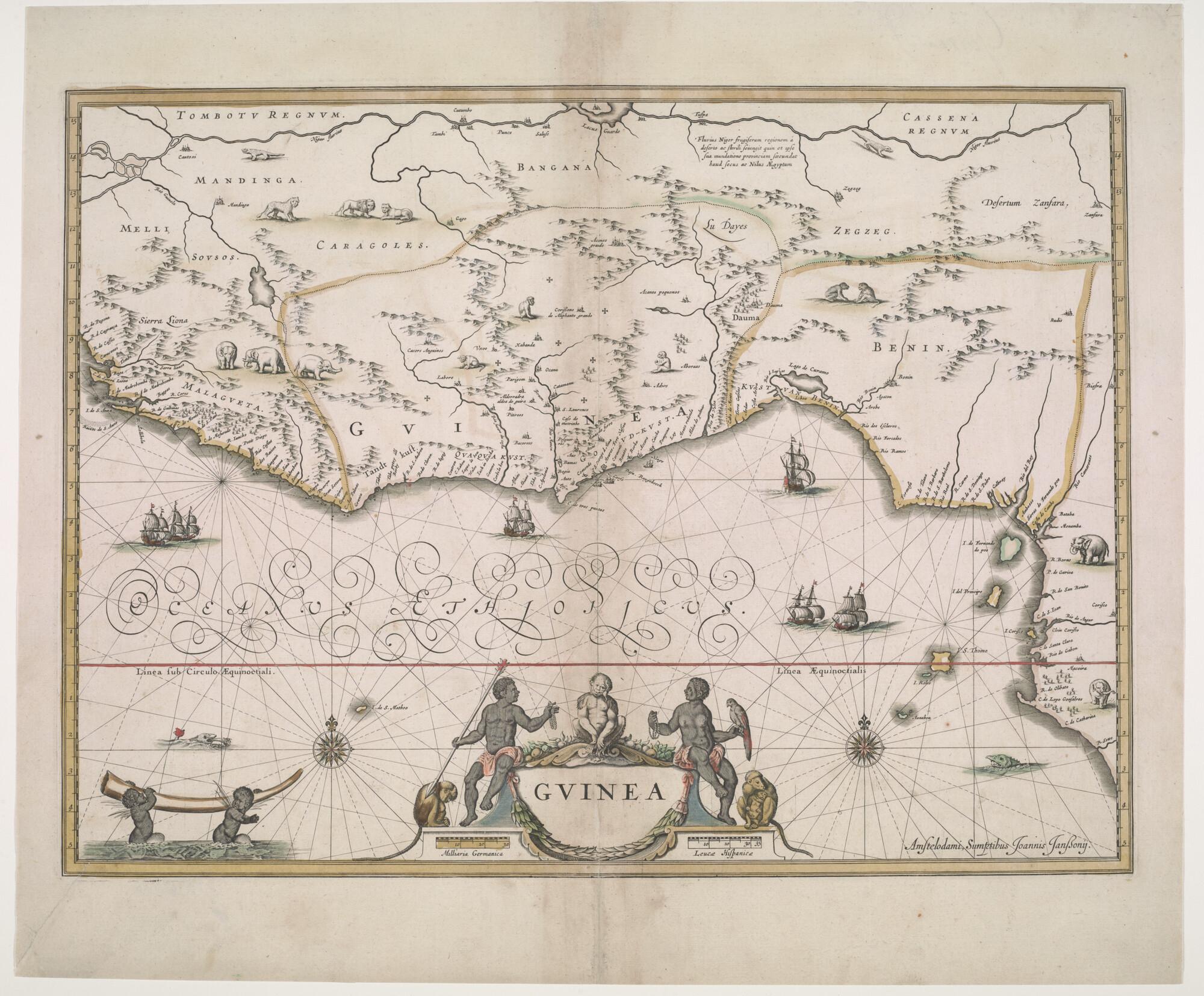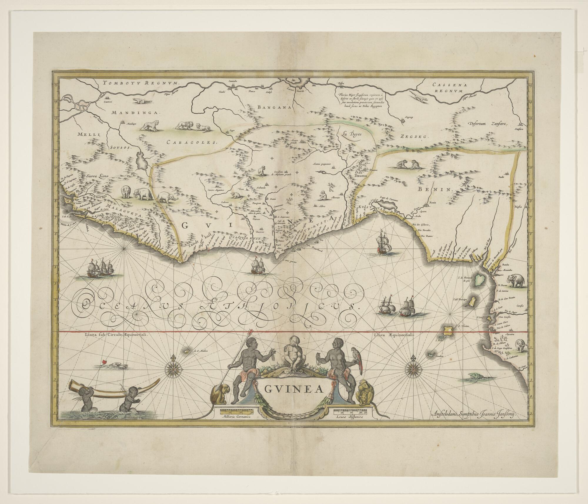 Met de hand gekleurde kaart van Guinea, door Johannes Janssonius (1588 - 1664), Amsterdam, circa 1636 (schaal 1 op 5.000.000).