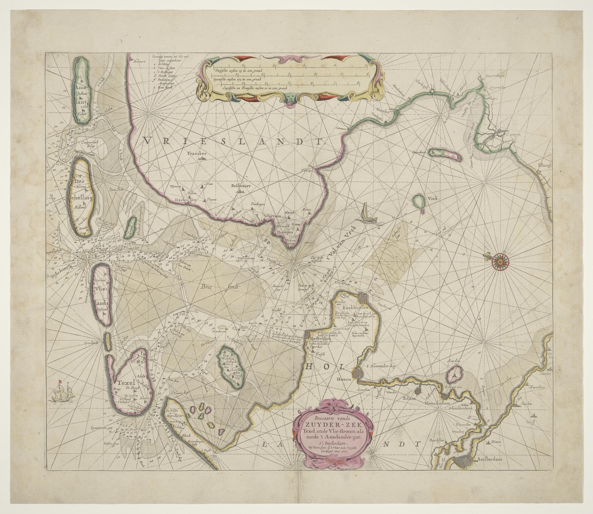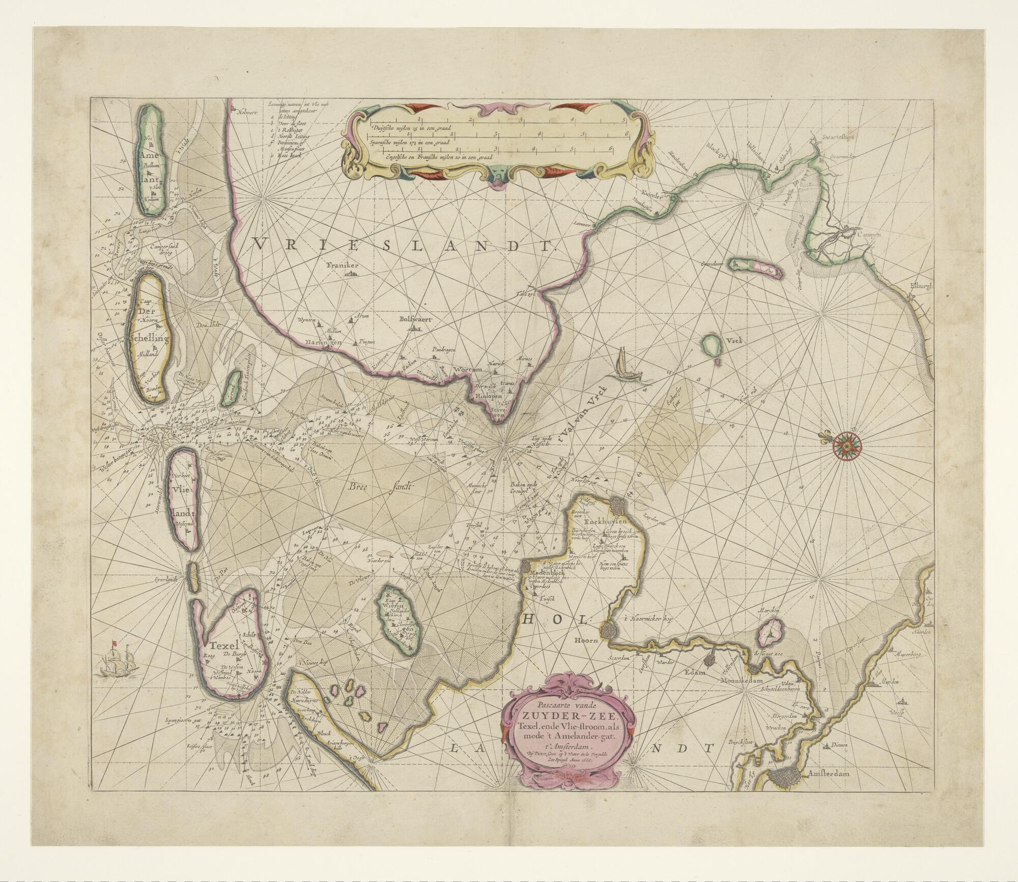 Met de hand gekleurde kaart van de Zuiderzee, de Waddenzee en -eilanden, door Pieter Goos (ca 1616 - 1675), Amsterdam, 1666 (schaal 1 op 250.000).