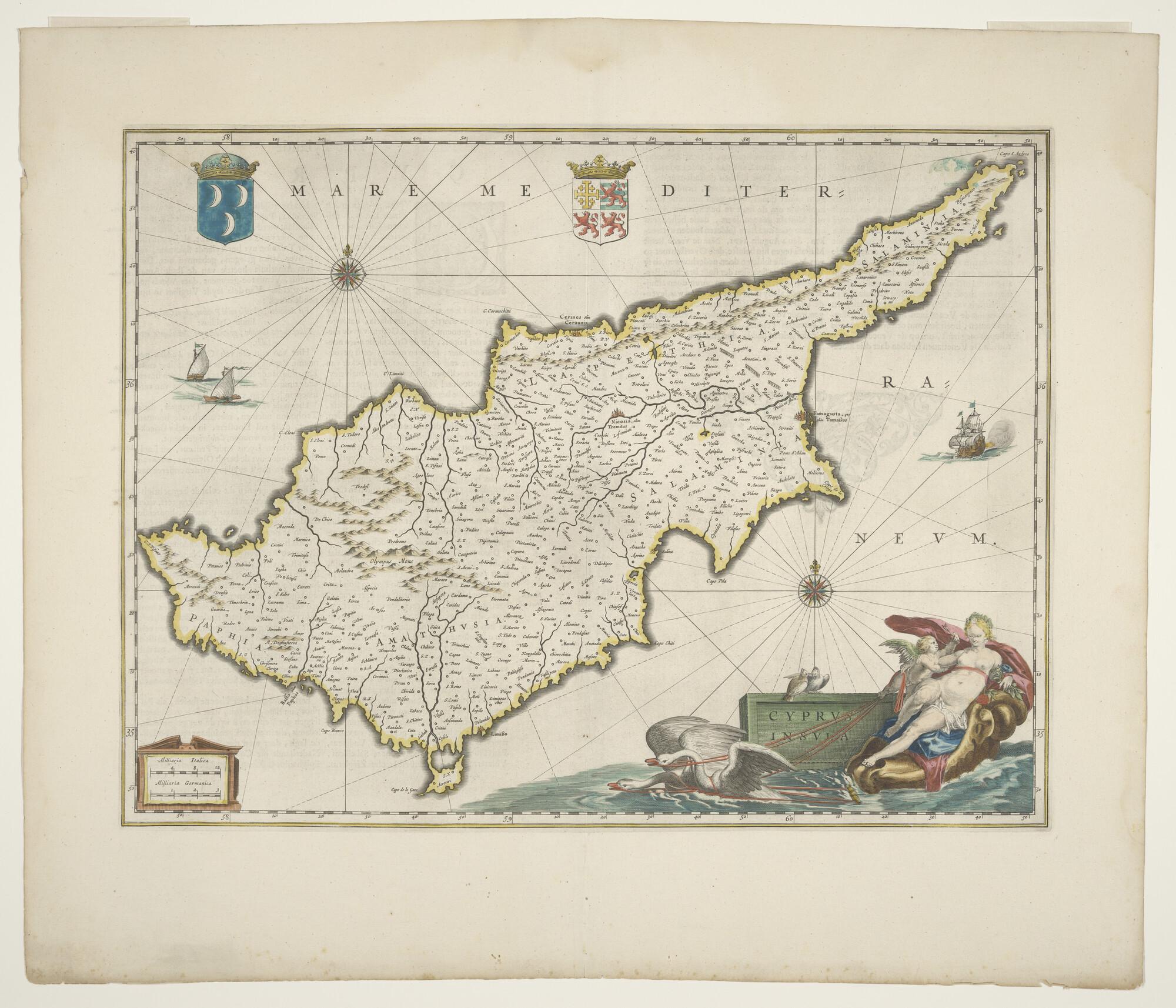 Met de hand gekleurde kaart van het eiland Cyprus door Johannes Janssonius, Amsterdam, circa 1654 (schaal 1 op 600.000).