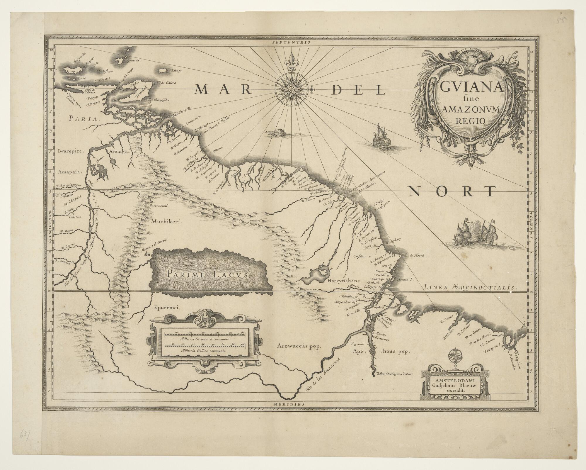 Kaart van een deel van de Atlantische Oceaan met Guiana en het gebied van de Amazone rivier, door Willem Jansz. Blaeu (1571 - 1638), Amsterdam circa 1630 (schaal 1 op 5.000.000).