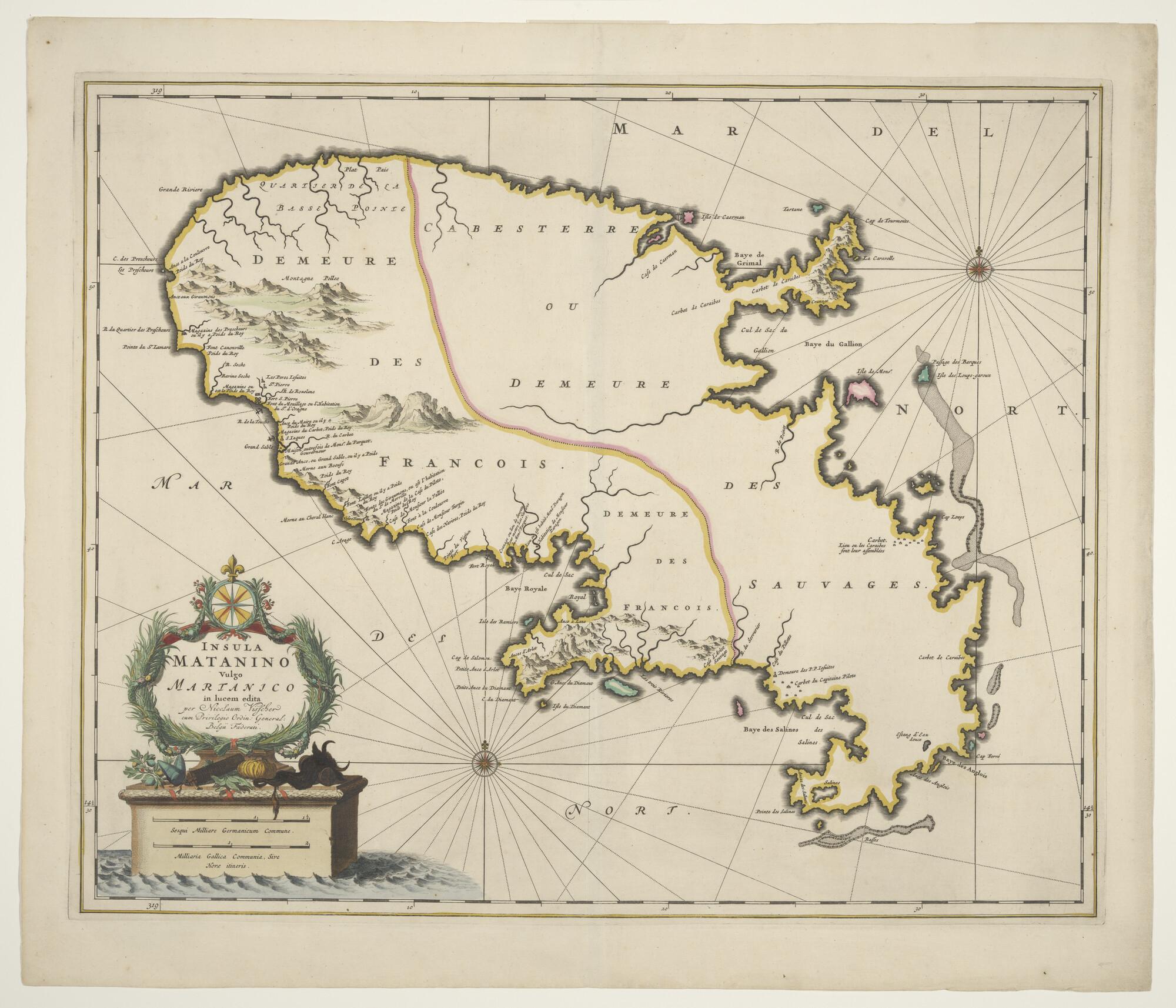 Met de hand gekleurde kaart van het eiland Martinique, door Nicolaas Jansz Visscher (1649 - 1702) te Amsterdam, circa 1698. Met opdracht aan de Staten-Generaal (schaal 1 op 700.000).