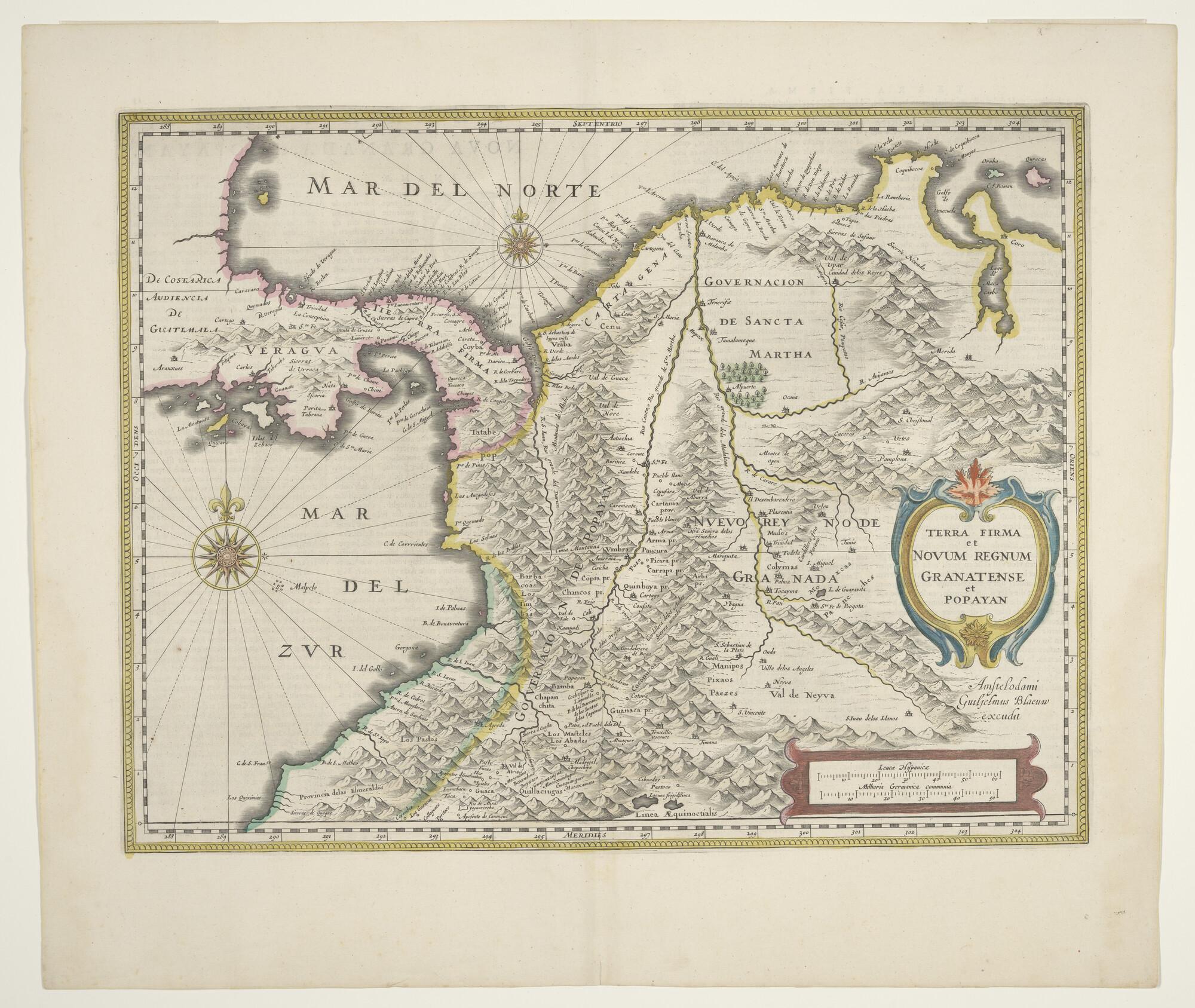 Met de hand gekleurde kaart van een gedeelte van Centraal- en Zuid-Amerika, door Willem Jansz. Blaeu, Amsterdam, 1630 (schaal 1 op 4.000.000).