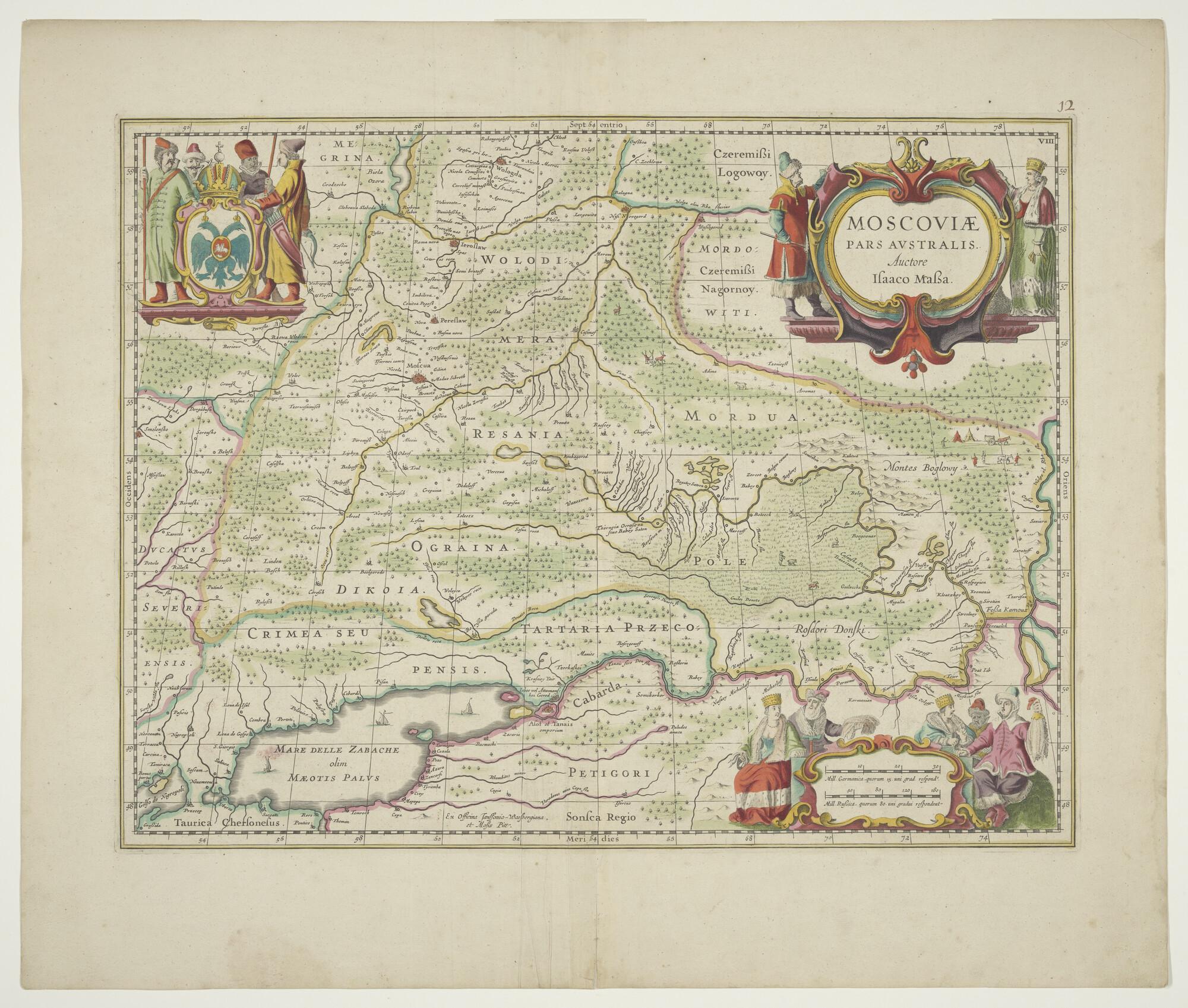 Met de hand gekleurde kaart van Moscovië door Isaac Massa (1586 - 1643), Amsterdam, circa 1638 uitgegeven door Johannes Janssonius (overleden 1664). Heruitave door Johann Waesberger (overleden 1681) & Moses Pitt (overleden 1696), circa 1680 (schaal 1 op 3.800.000).