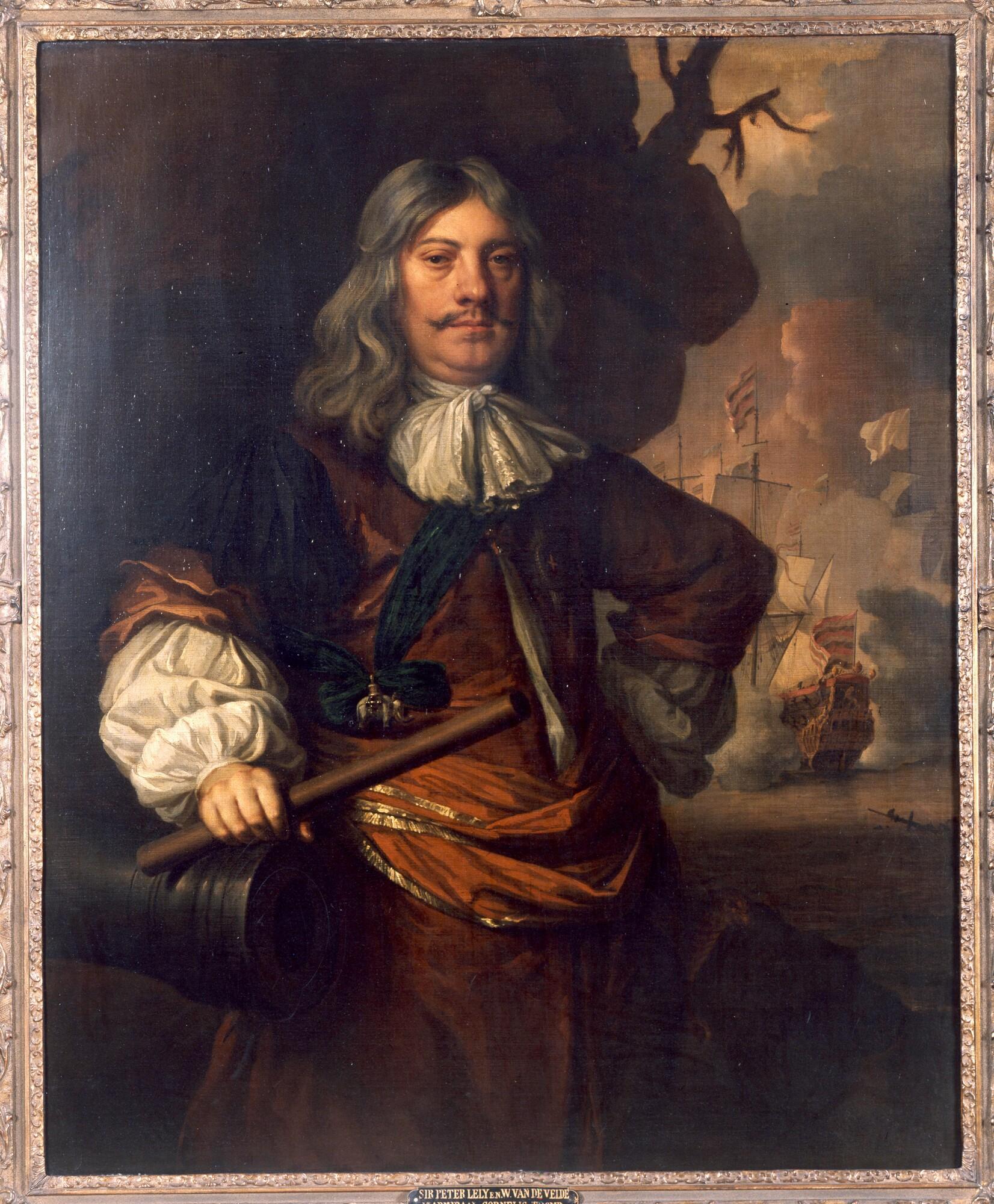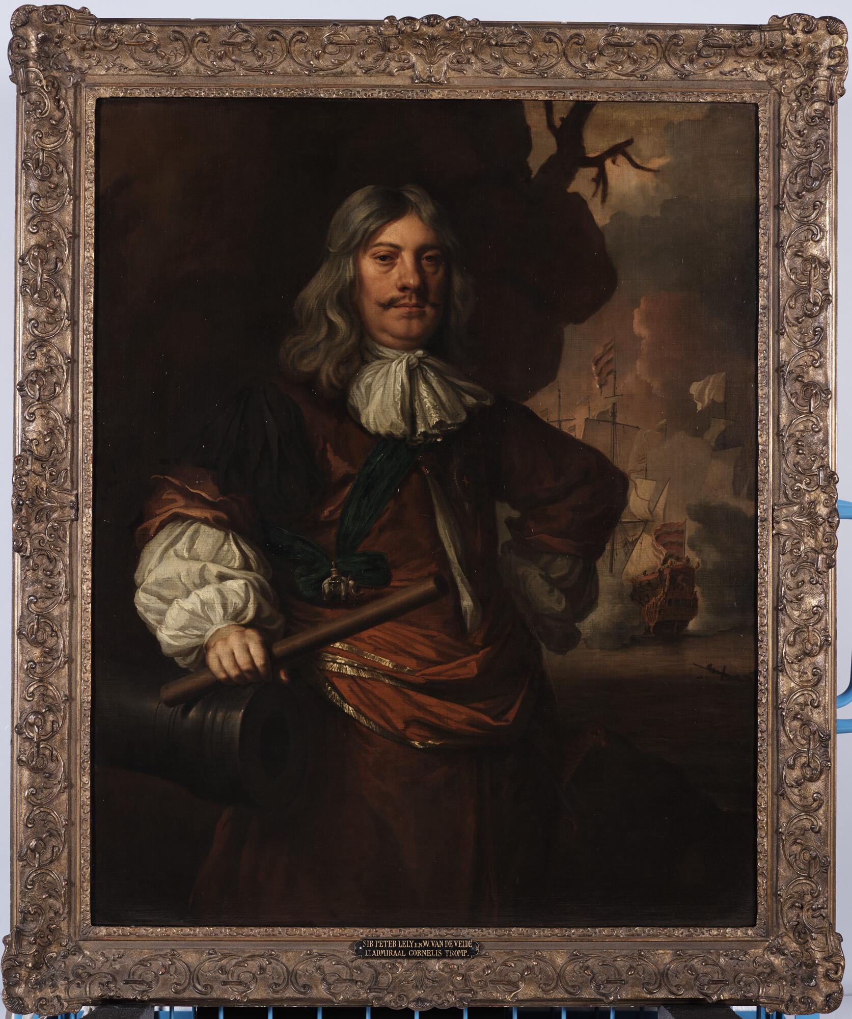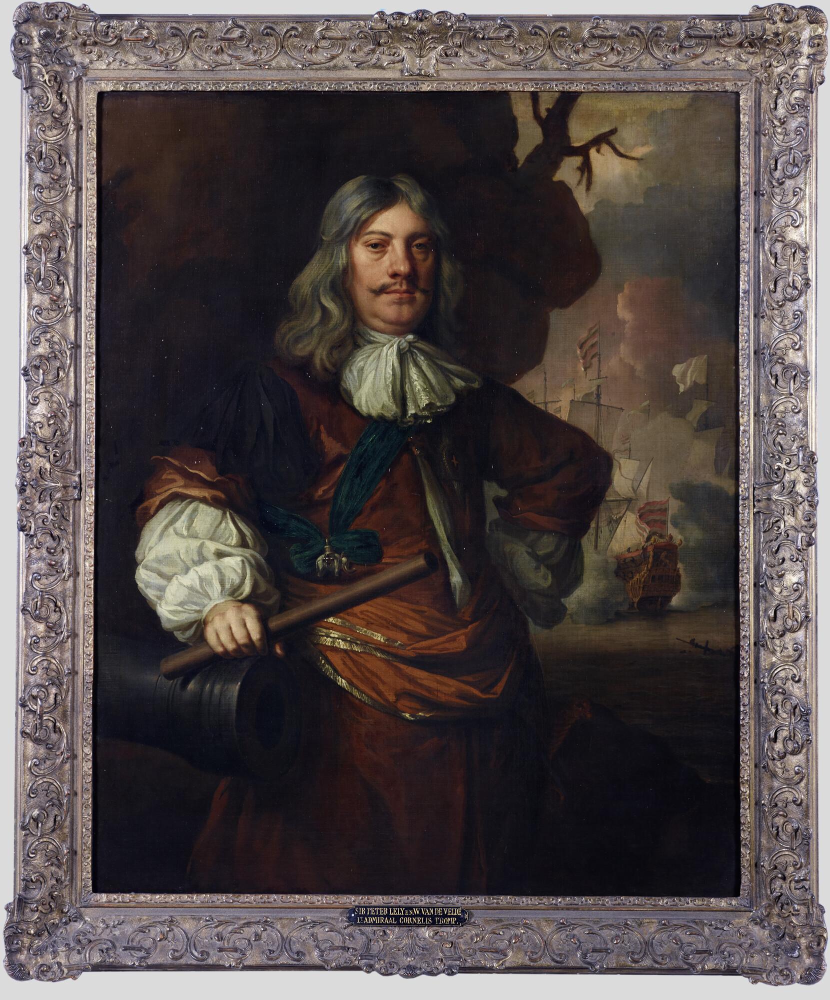 Portret van luitenant-admiraal Cornelis Tromp (1629-1691). Op de achtergrond een zeegezicht met zijn vlaggenschip De Gouden Leeuw in een vuurgevecht, geschilderd door Willem van de Velde de Jonge. Tromps rechterhand met commandostaf rust op de vuurmond van een kanon. Het schilderij is in dezelfde stijl vervaardigd als de serie portretten van Engelse admiralen door Peter ...