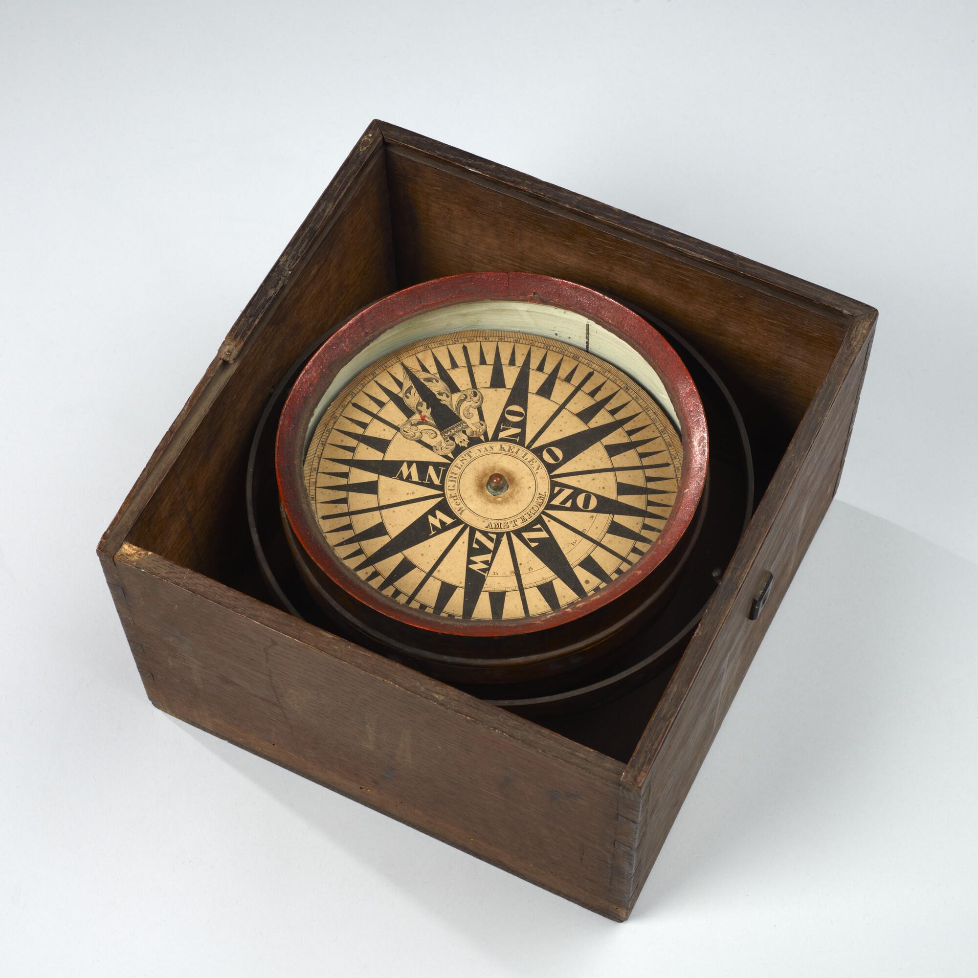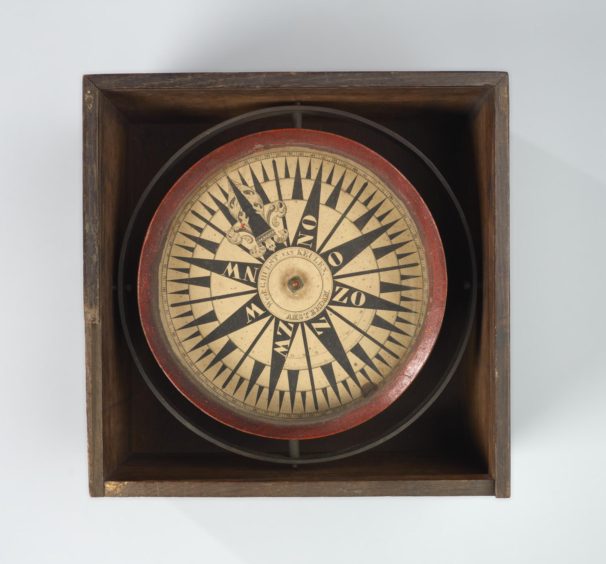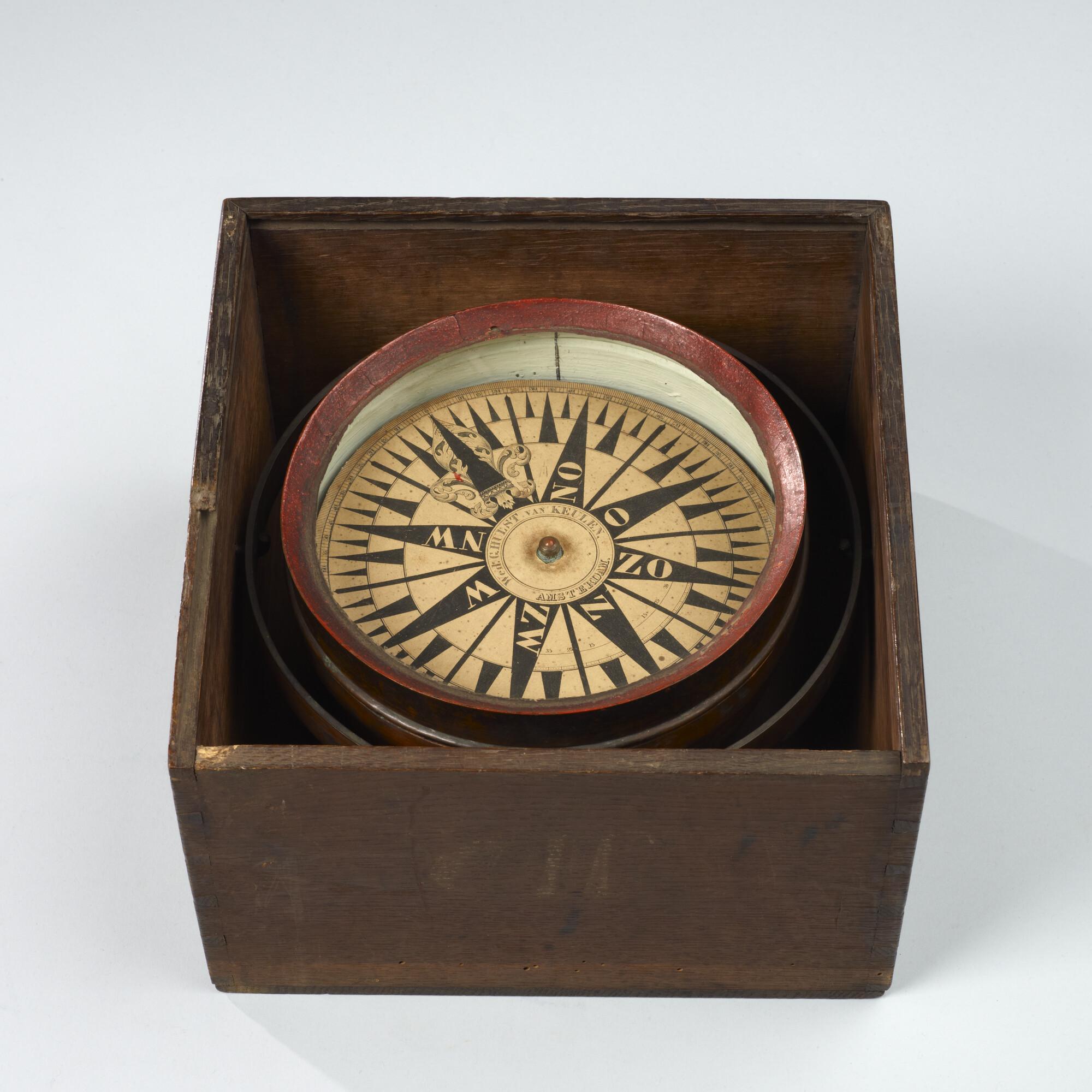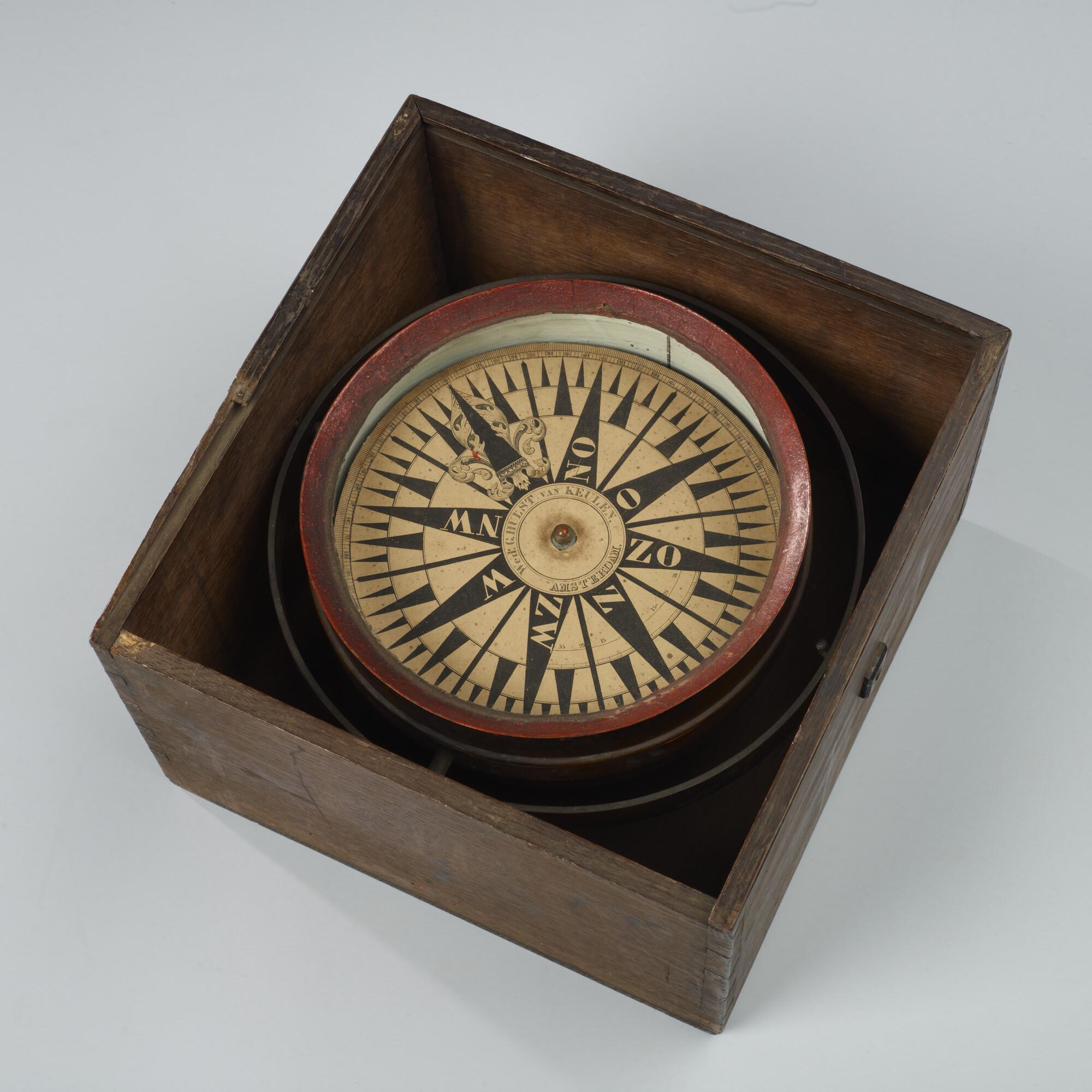 Kompas door Hulst van Keulen, Amsterdam, 1840-1860. Ronde koperen ketel, cardanisch gehangen in een vierkante houten kist. Op ½ streek nauwkeurig. Graadverd. 0° - 90° op 1° nauwkeurig aan weerszijden van Z. Schuivende roos met één naald, circa 35 gram.