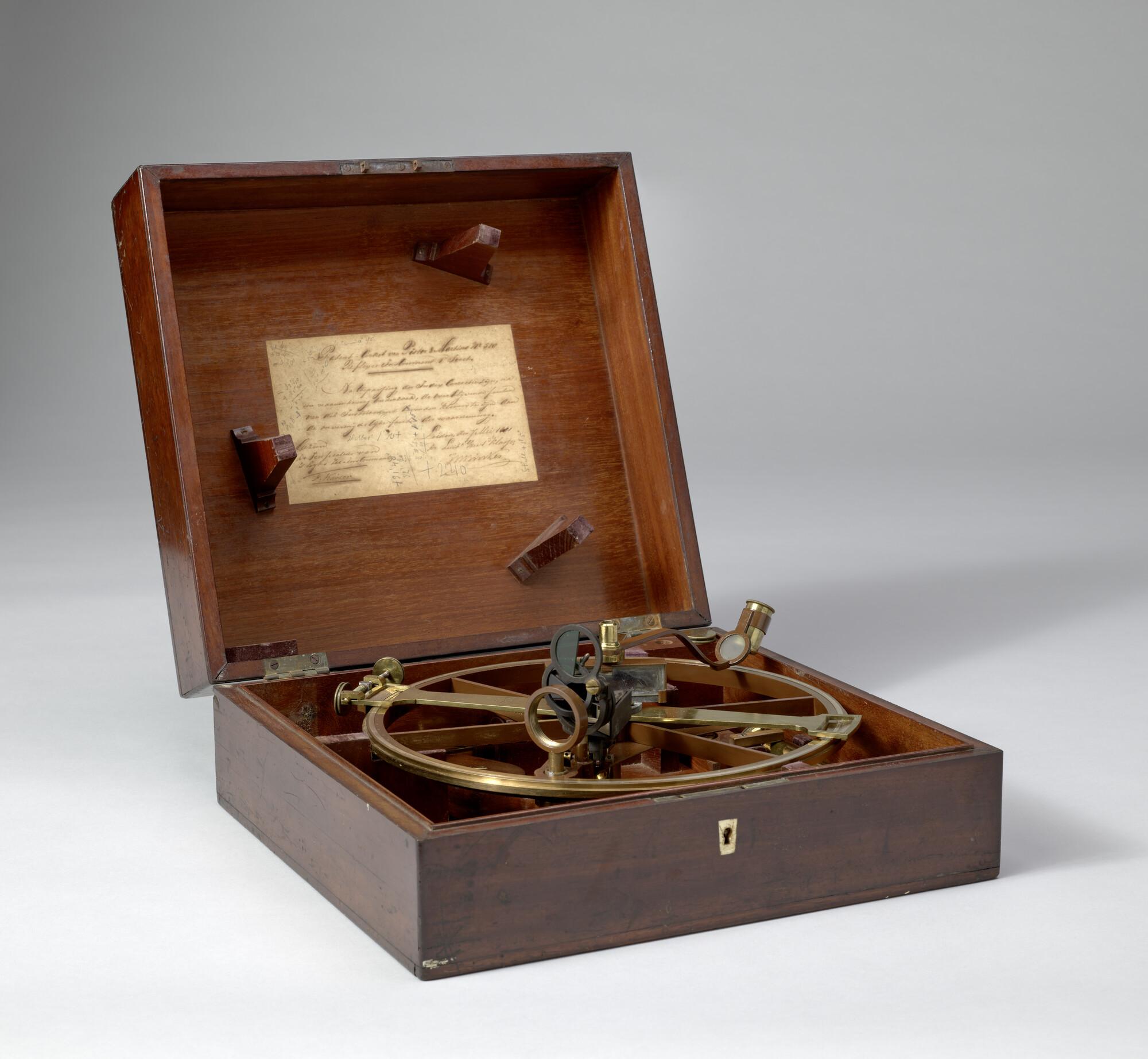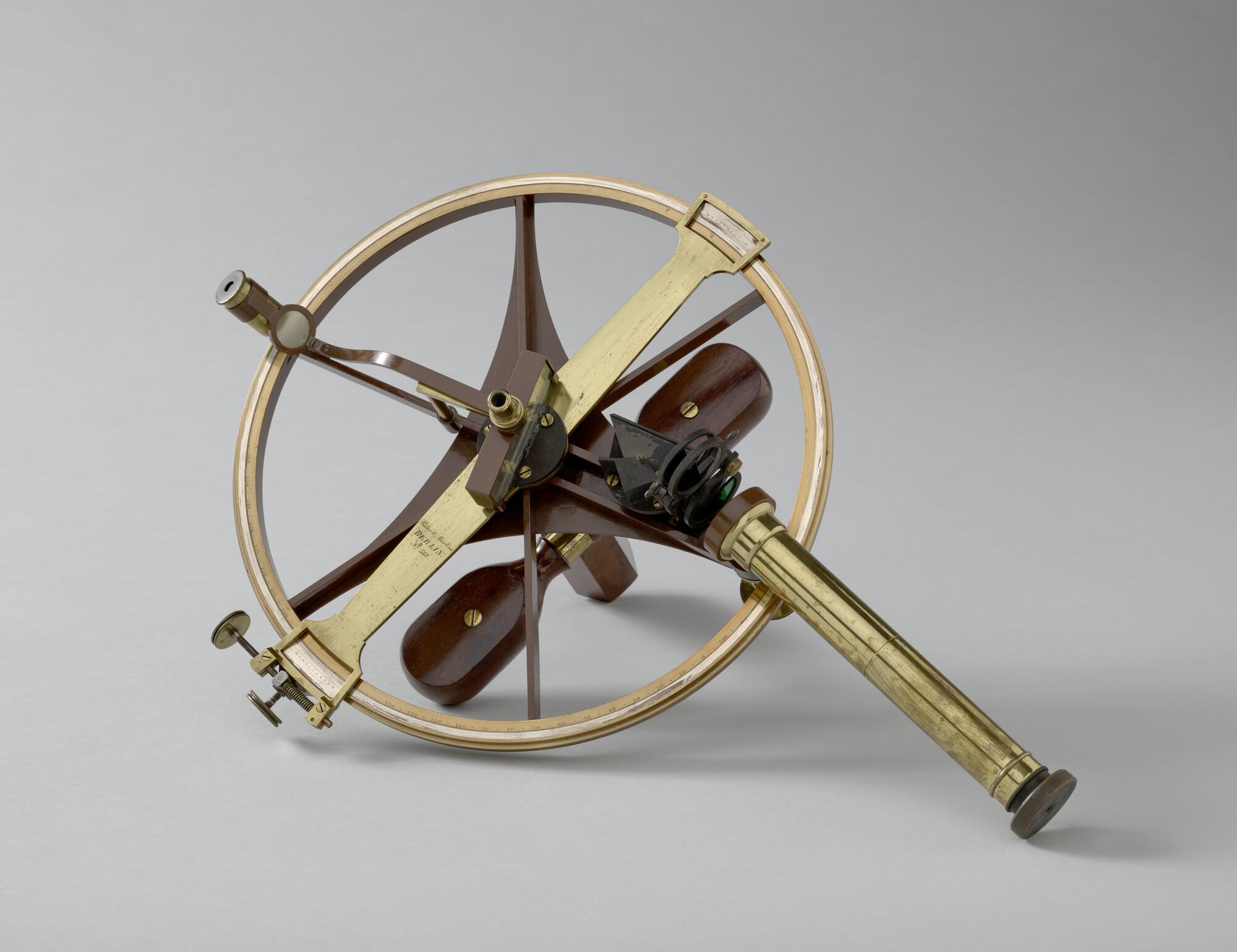 Prismacirkel door Pistor & Martins, Berlijn, 1850-70. Twee gekleurde glazen (rood & groen), twee kimglazen (rood & groen). Graadverd.: 350° - 0° & 0° - 260° in 10'. Nonius -10' t/m + 10' afleesbaar op 10" nauwkeurig. Met haarschroef & loep.