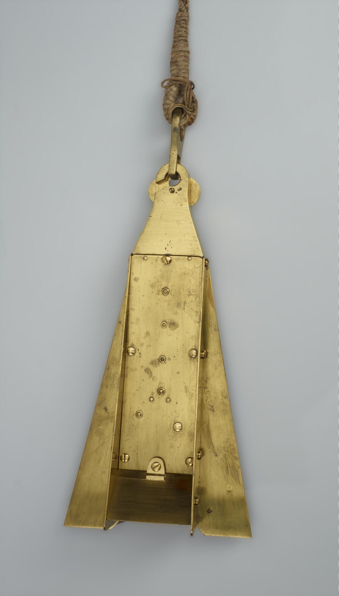 Mechanisch patentlog door Edward Massey (patent 1854) , Londen, 1854 - 1866. Telwerk met drie klokjes: 1 mijl, 0 - 10 mijl & 0 - 100 mijl, logvin ontbreekt.