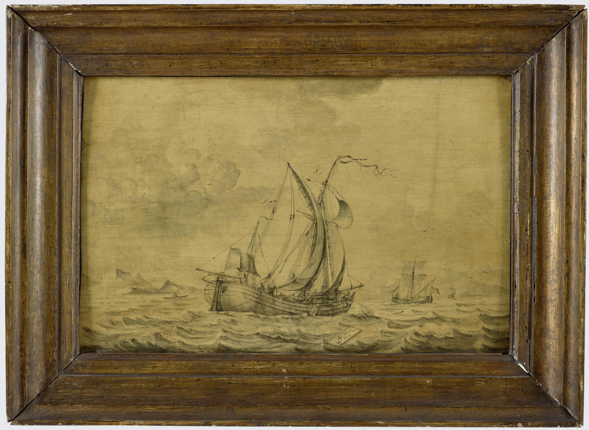 Een kofschip, een hoeker en in de achtergrond rechts een schip, alle onder zeil voor een rotsige kust, met links een kajak. Deze pentekening beeldt waarschijnlijk drie kleine koopvaardijschepen die ruilhandel met de Inuit in Straat Davis, langs de westkust van Groenland, uitoefenen.