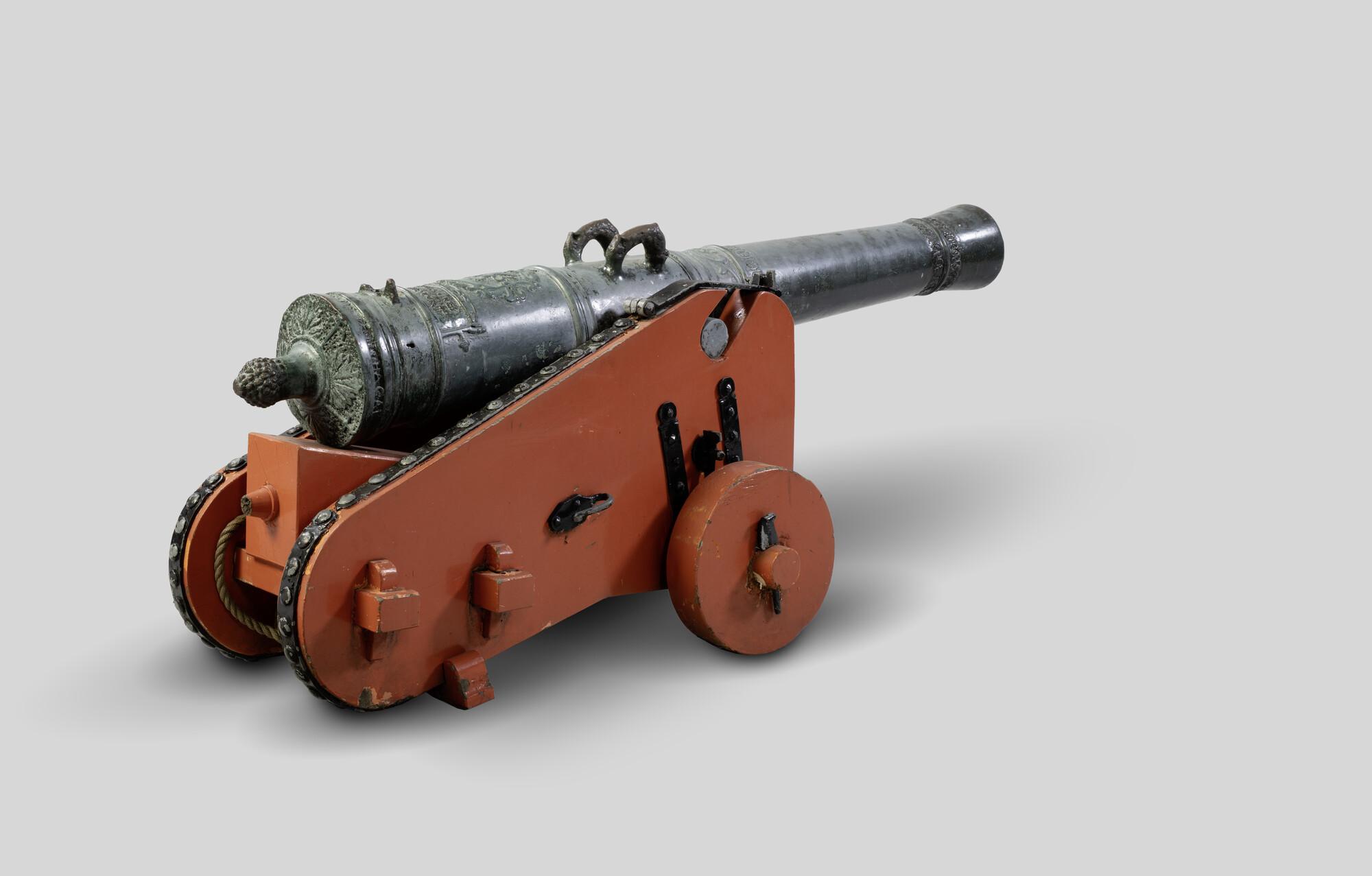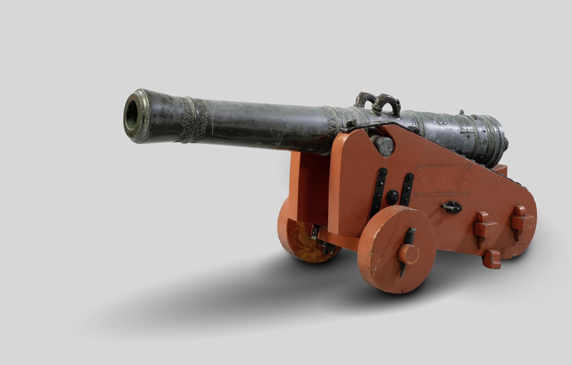Kanon, geboord voor 6-ponds kogels, Admiraliteit model. Coenraet Wegwaert behoorde tot een bekend geslacht van gieters en beheerde van 1640 tot 1669 de geschutsgieterij die op initiatief van de Staten van Holland in de voormalige kloosterkerk op het Lange Voorhout was ingericht. In de jaren dat Coenraet werkzaam was, zijn opvallend veel metalen zesponders vervaardigd. ...