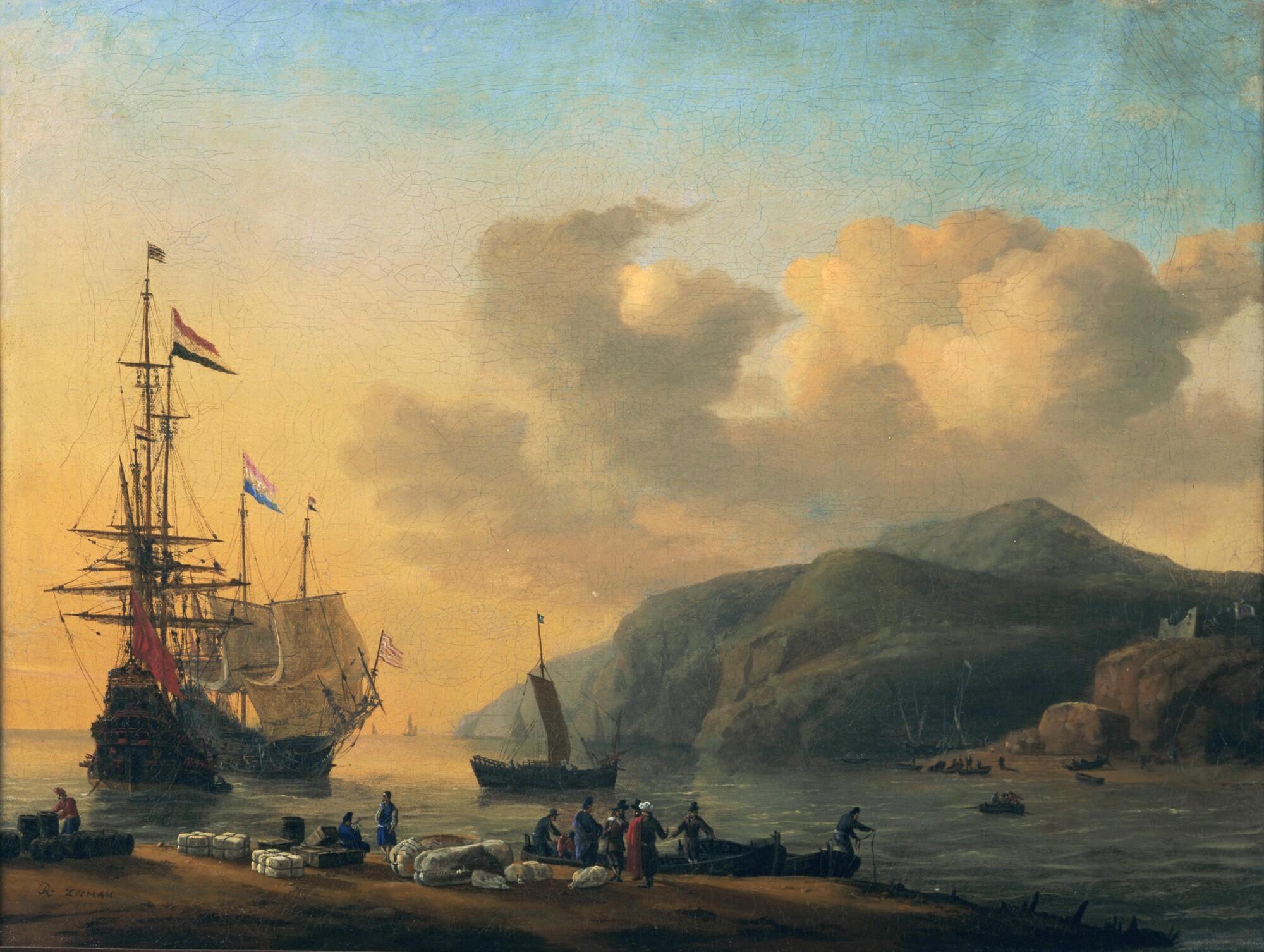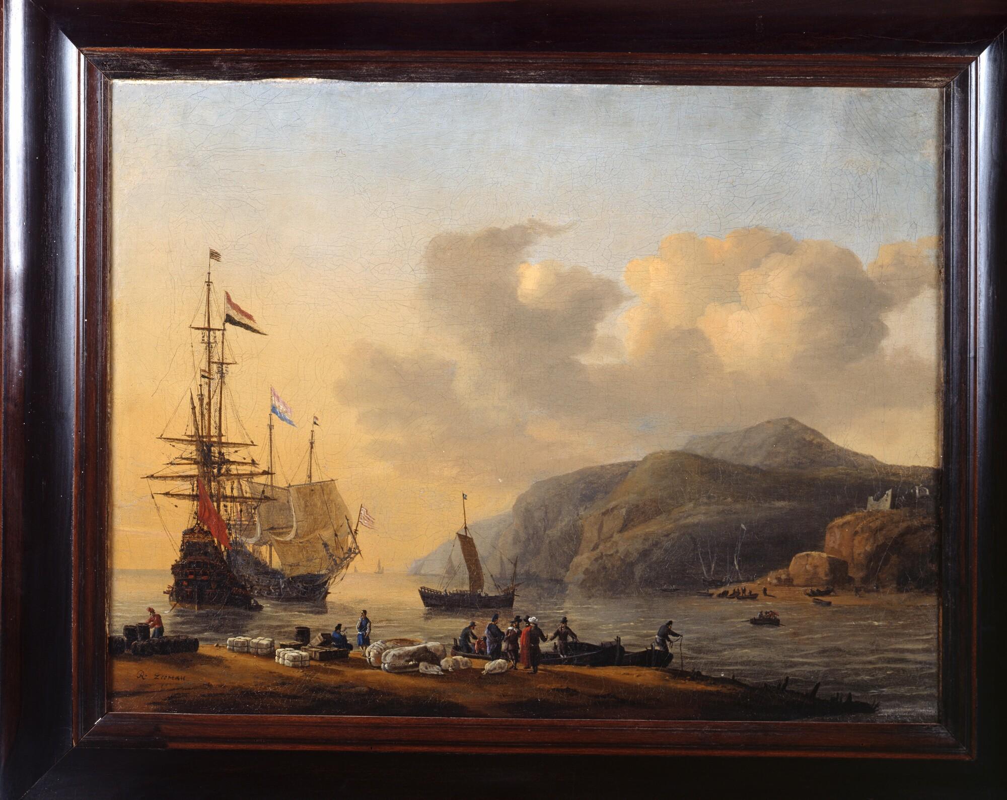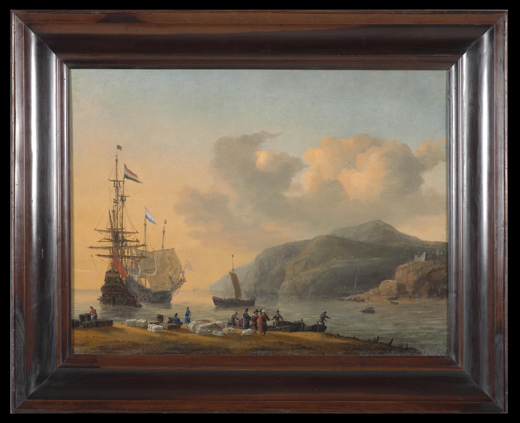Schilderij in lijst van Nederlandse schepen op een Levantijnse rede. Op de voorgrond kooplieden die handel drijven.