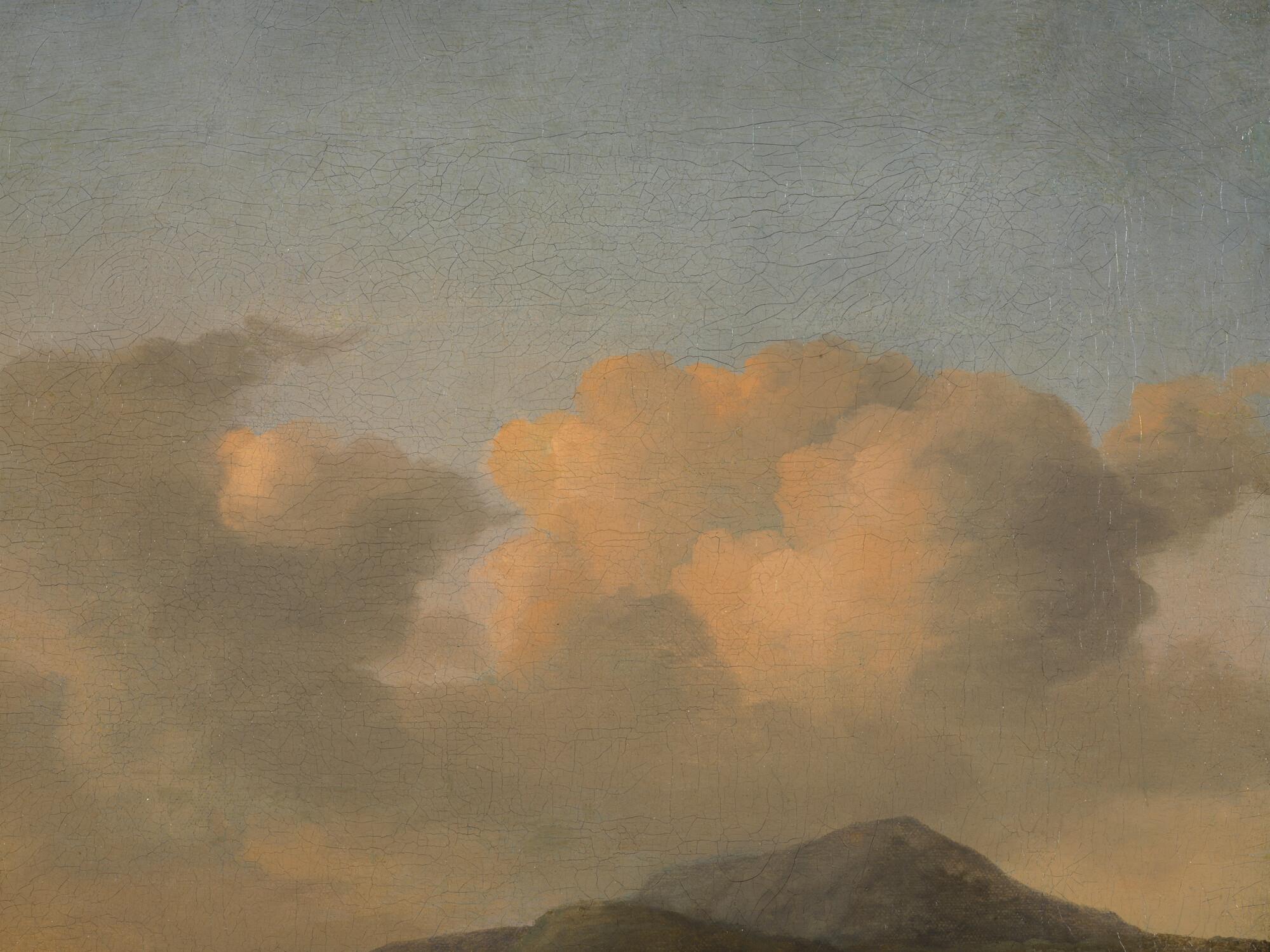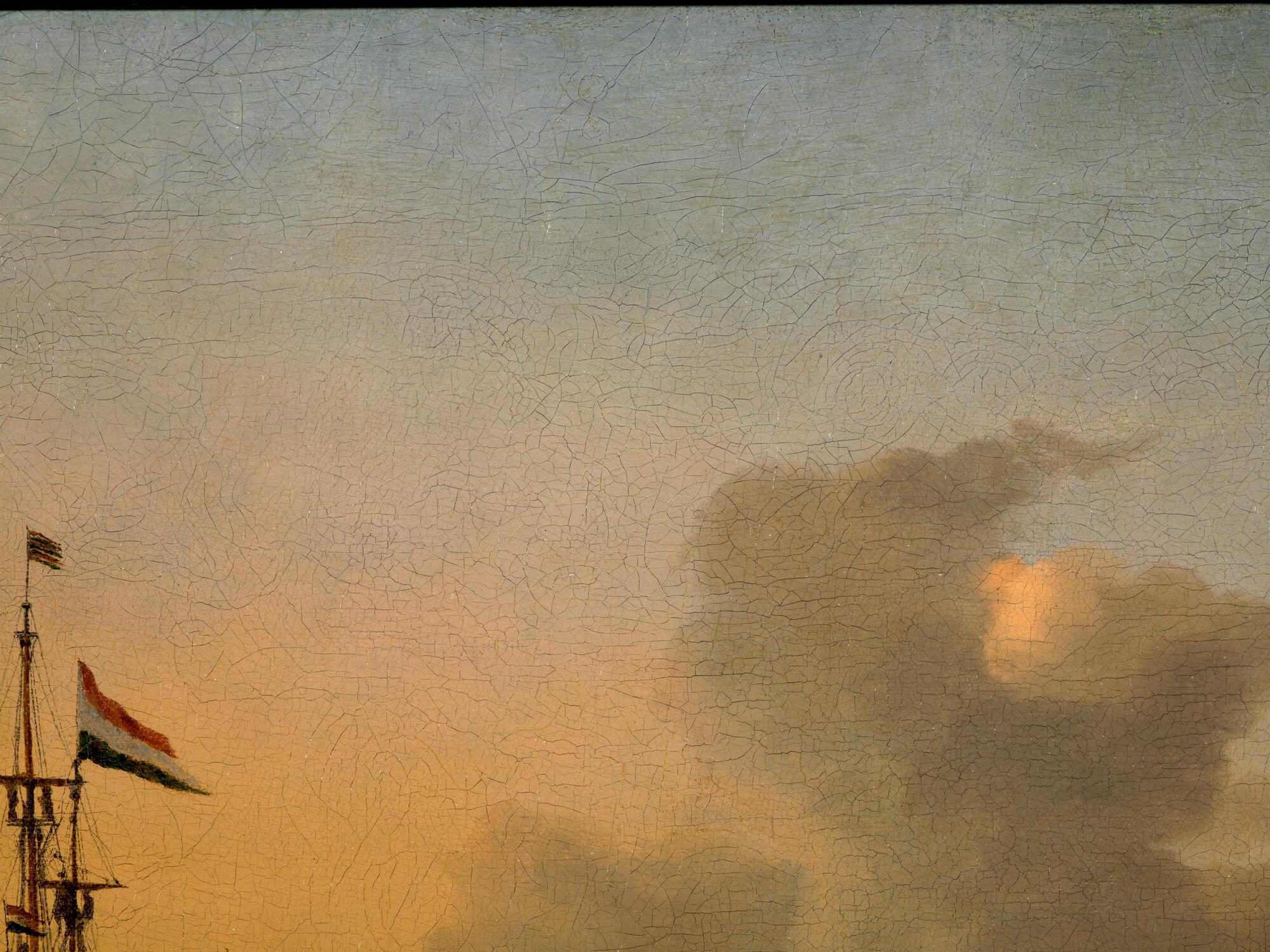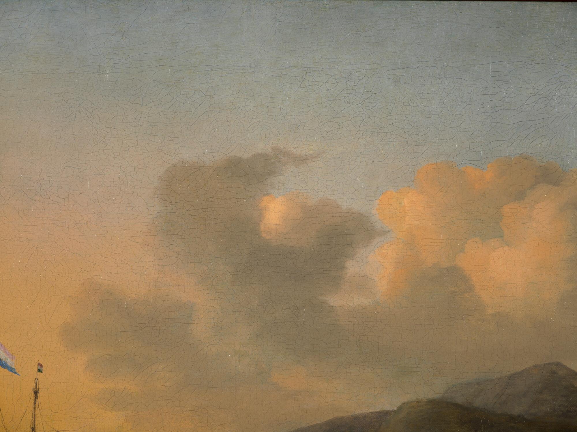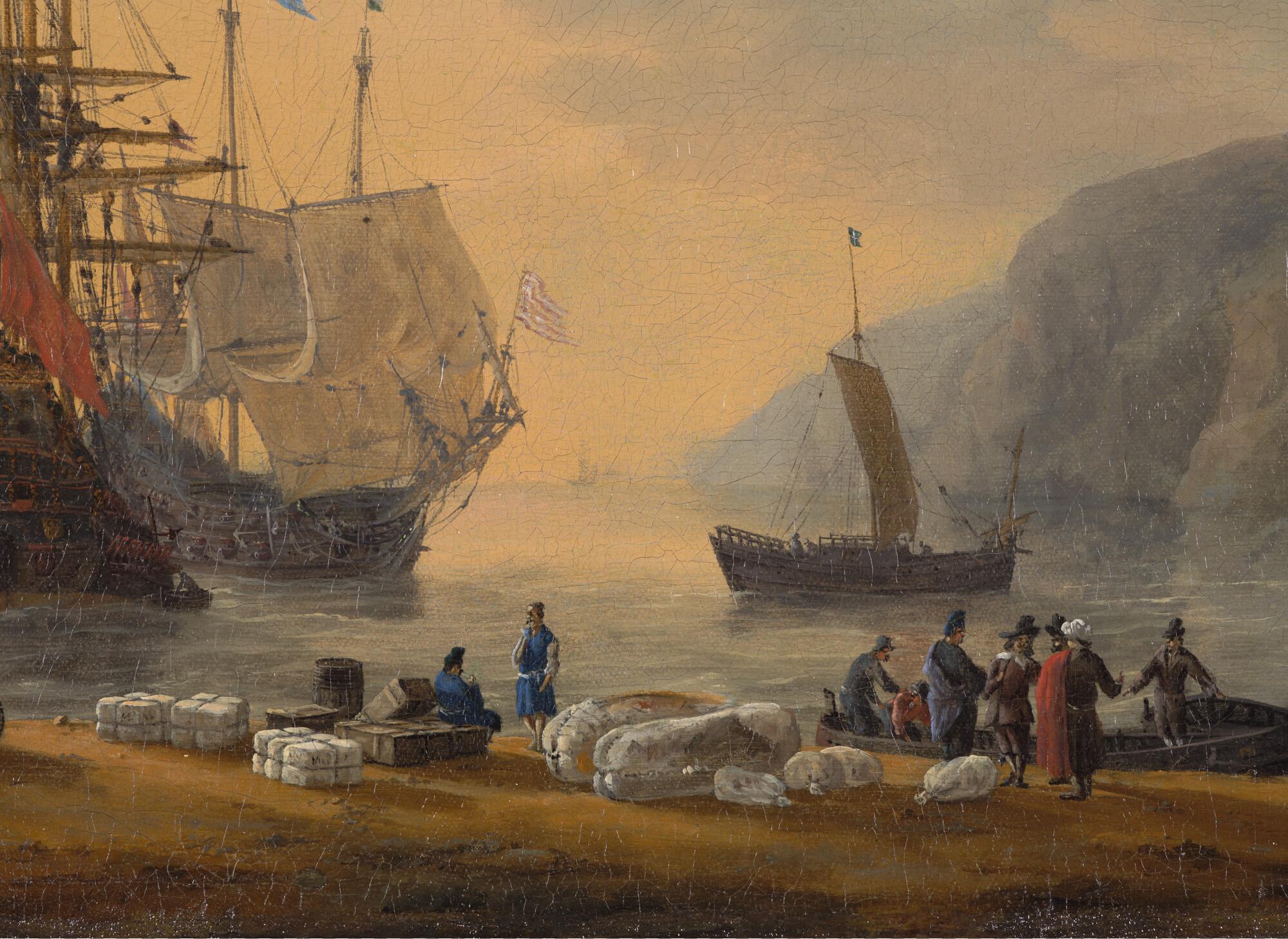 Schilderij in lijst van Nederlandse schepen op een Levantijnse rede. Op de voorgrond kooplieden die handel drijven.