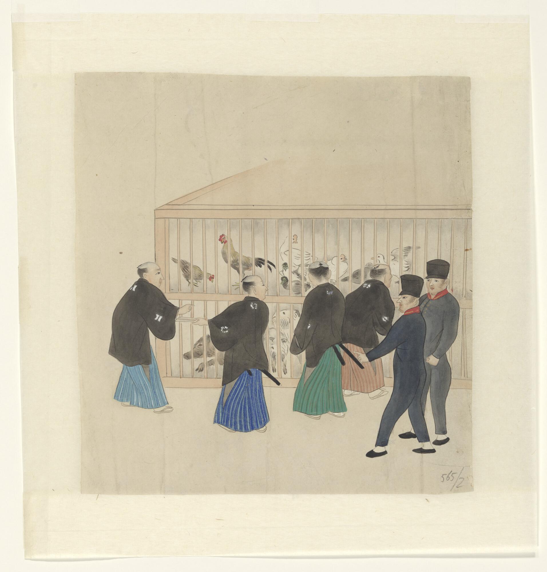 Japanners en twee Nederlandse marineofficieren (?) bij een kooi met pluimvee, varkens en schapen.
