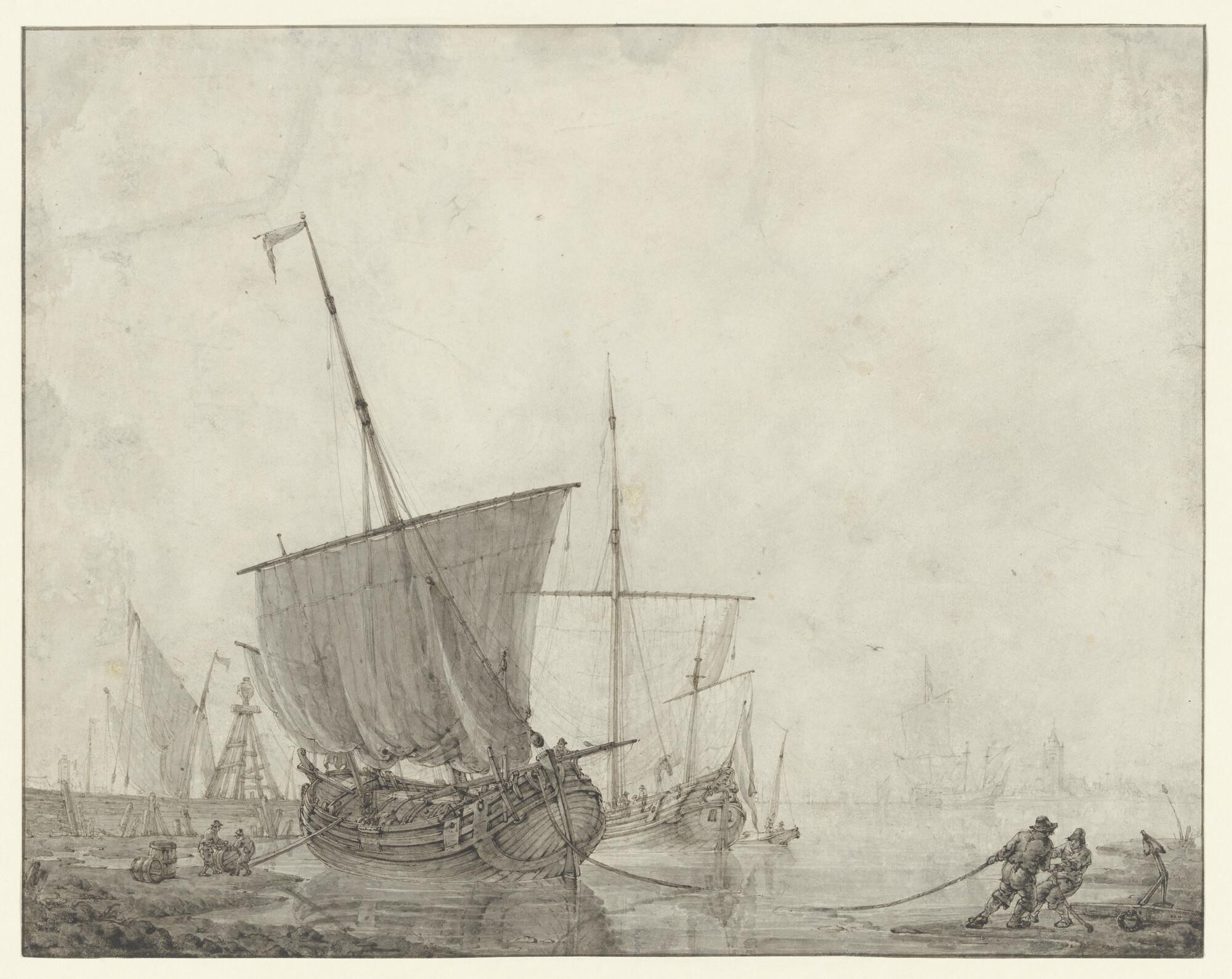 Een hoekerschip en een buisschip in een getijhaven vaten lossende