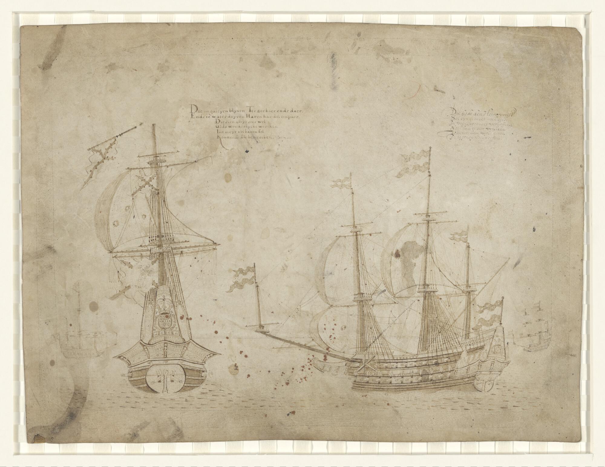 Gevecht tussen een Nederlands en een Spaans oorlogsschip, wellicht een verwijzing naar de Zeeslag bij Gibraltar, 1607.
