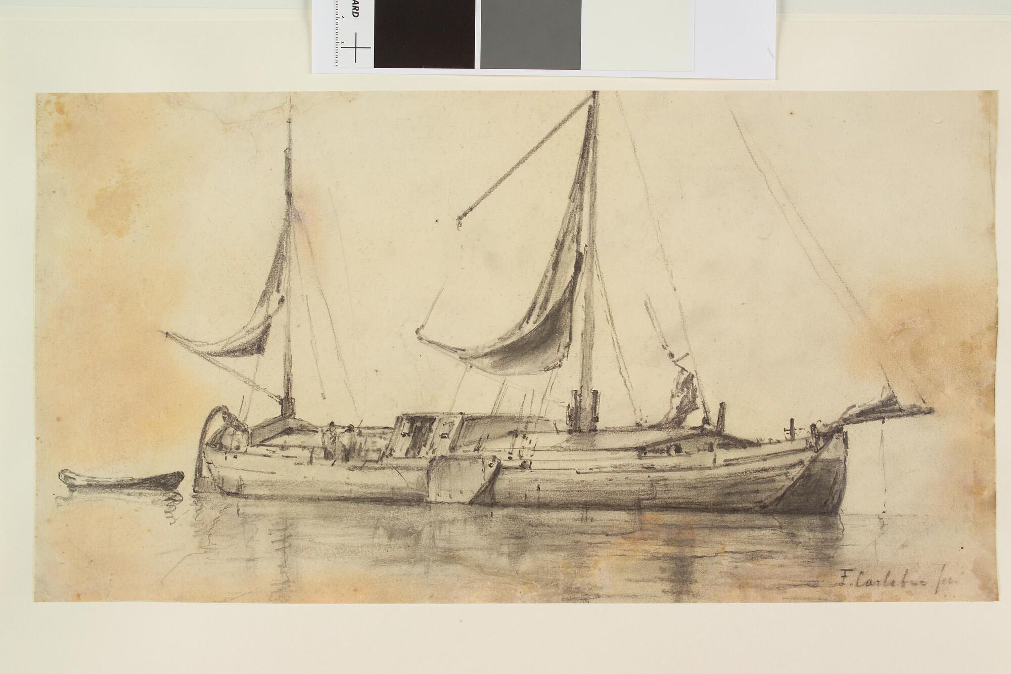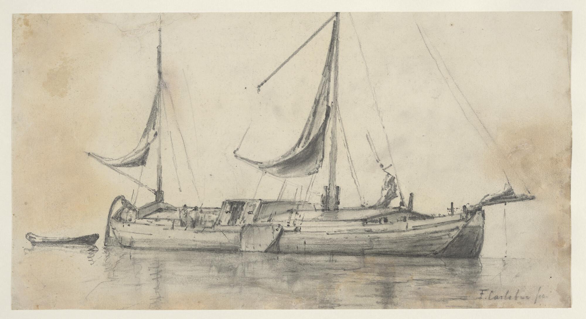 Een ten anker liggende keen, midden negentiende eeuw.