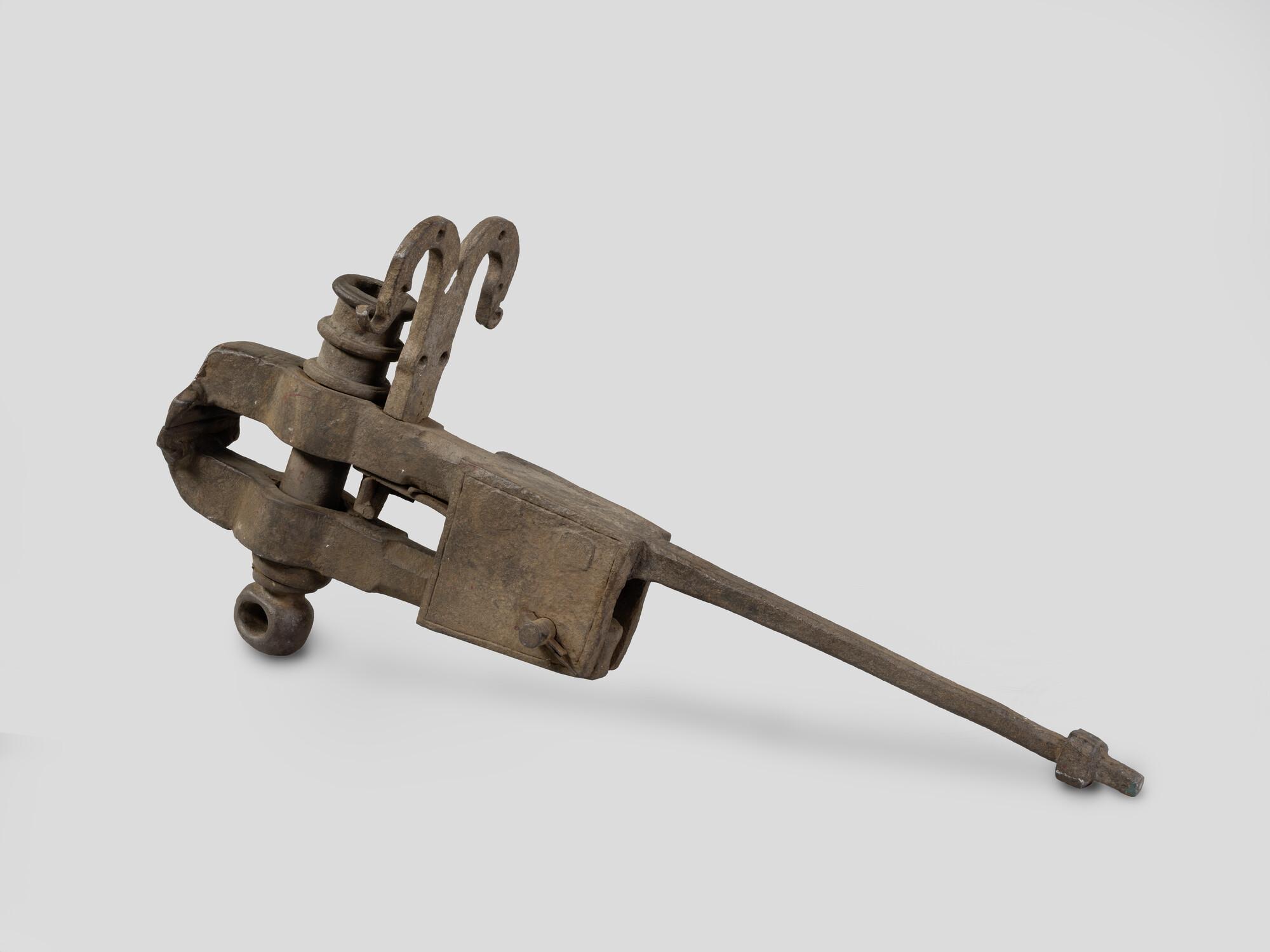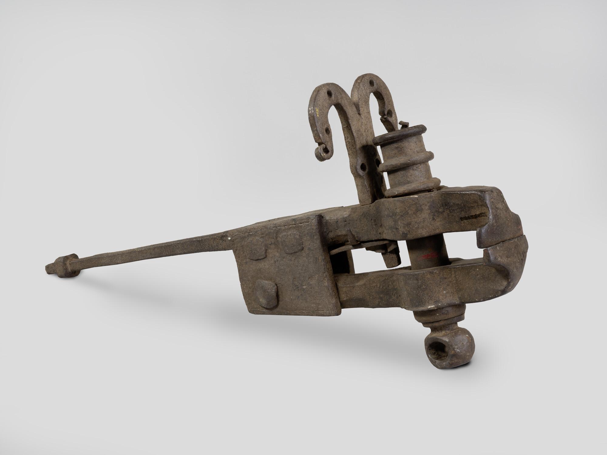 Staartbankschroef, (volgens de verkoper) uit het begin van de negentiende eeuw, en afkomstig van een scheepswerf. De twee klauwen zijn verankerd in een kast, van waaruit naar onderen de staart steekt. Aan het eind van de staart een gesmede knop. De spindel-handl.