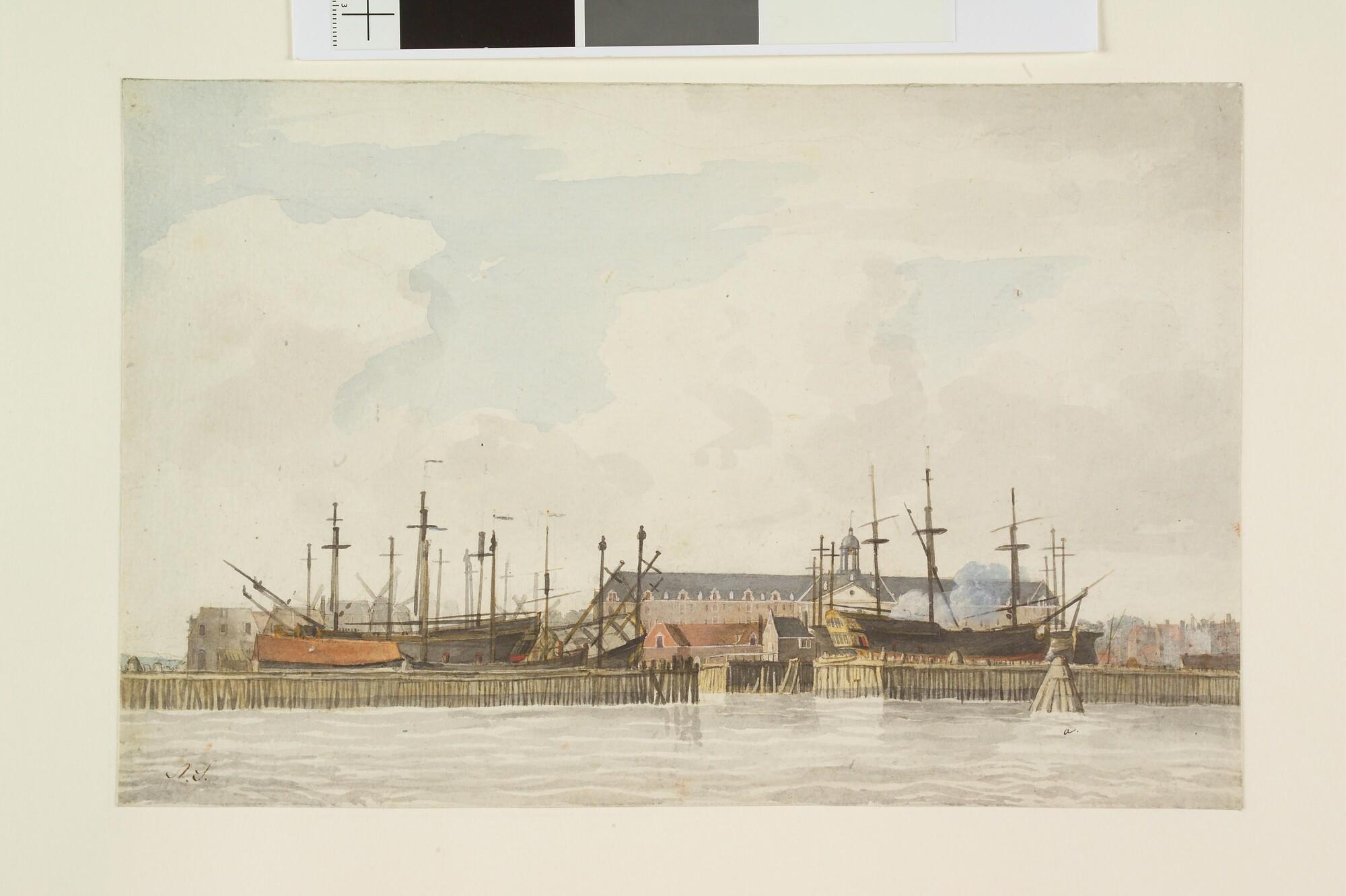 Het Oost-Indisch Zeemagazijn van de VOC te Amsterdam. Gezicht op de 'Compagnies Boom', de ingang tot het 'dok' van de VOC-werf. Op de voorgrond zijn de palen te zien met op de tweede rij het wachthuisje. Daarachter de werf en het Oostindisch Magazijn.