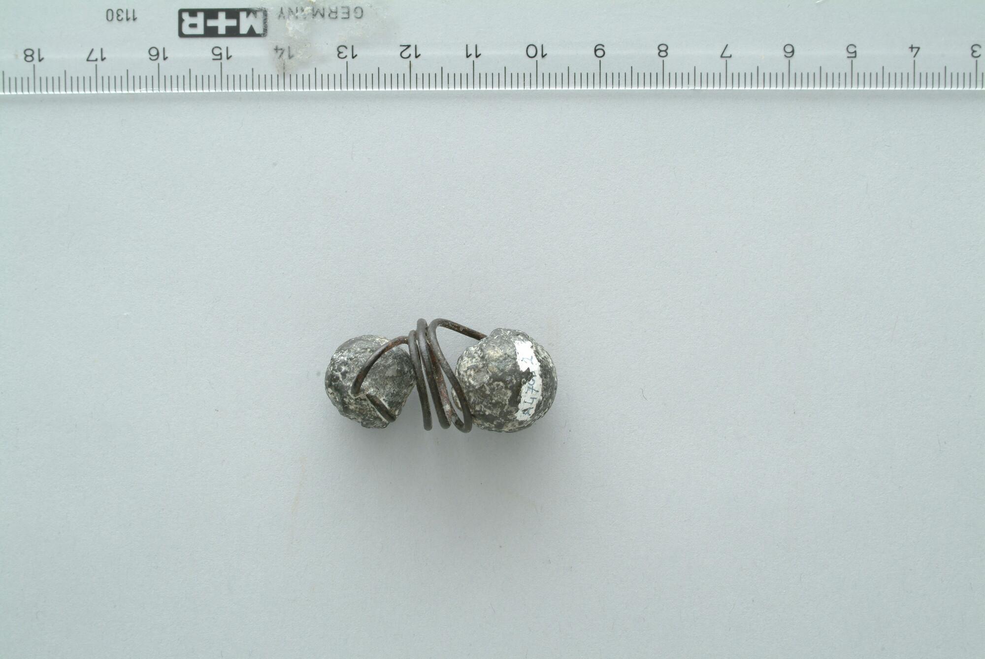 Springkogel of draadkogel voor musket, bestaande uit twee loden kogels verbonden door een veer.