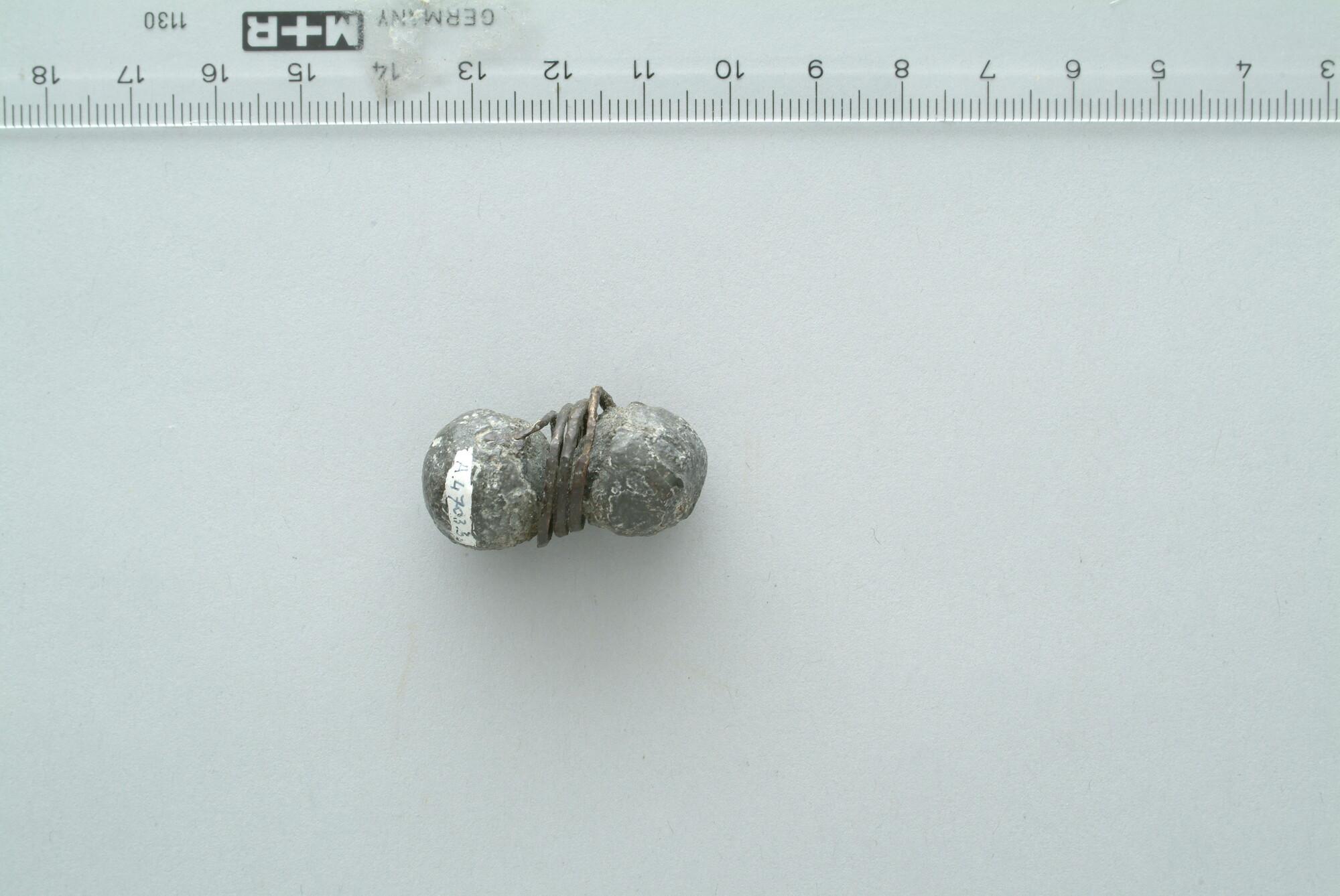 Springkogel of draadkogel voor musket, bestaande uit twee loden kogels verbonden door een veer.