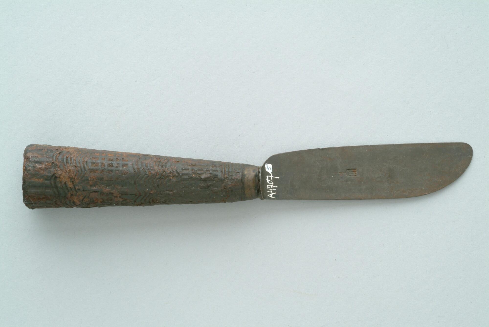 Mesheft gedraaid bewerkt, met gereconstrueerd lemmet en met messing verstevigingsbandje om heft bij overgang naar lemmet.