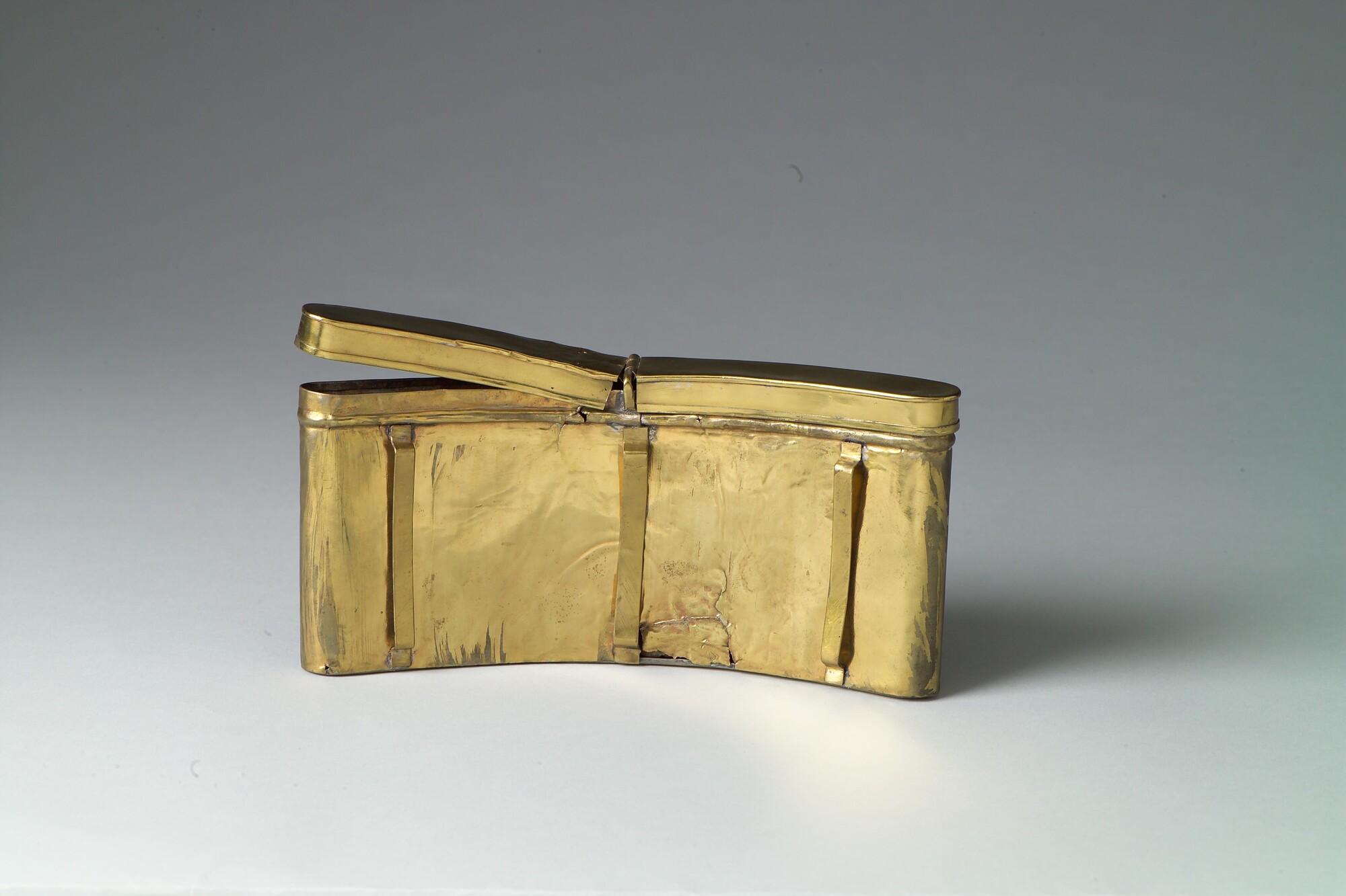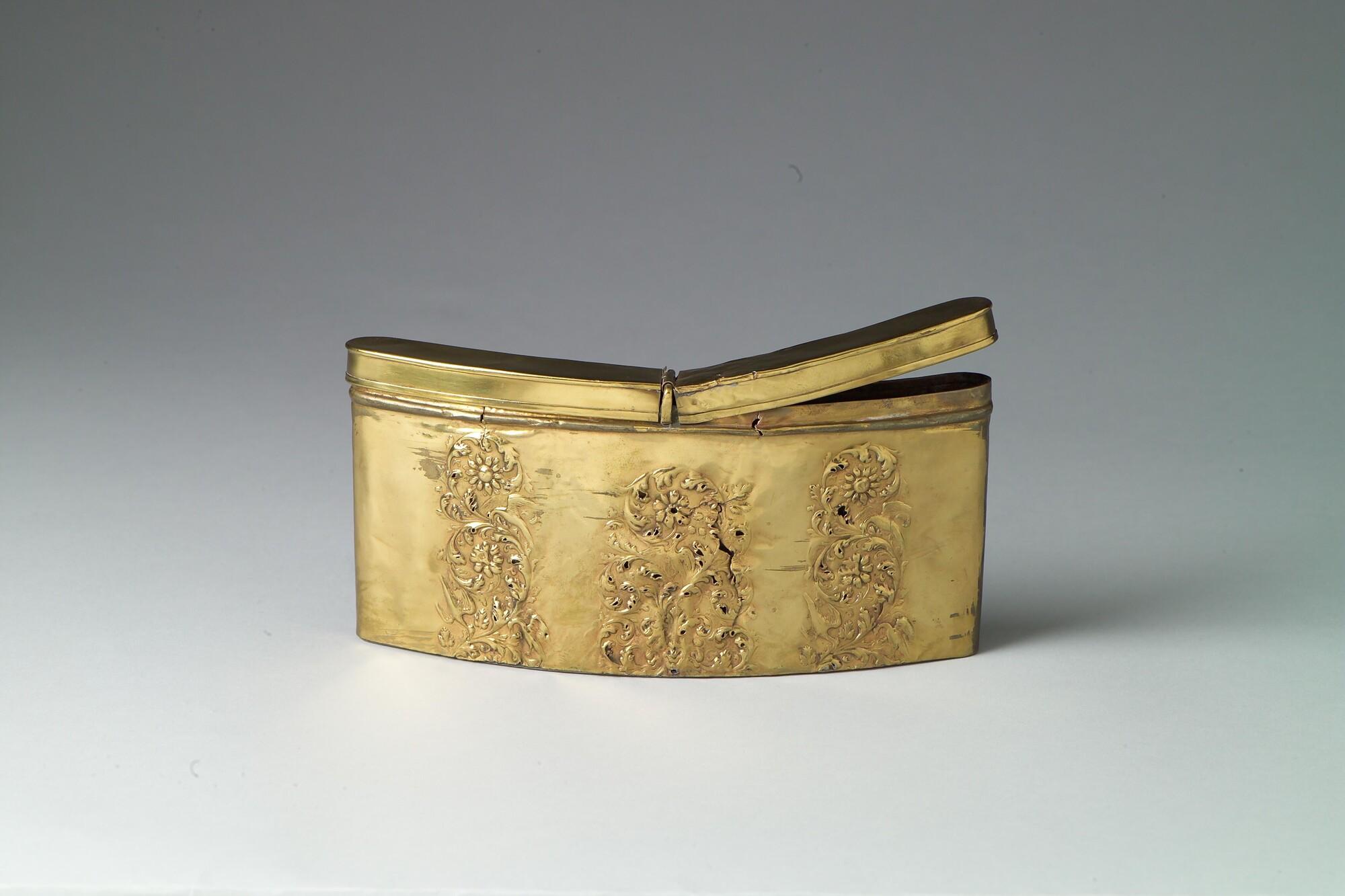 Patroontas of patroonhouder van bewerkt messing, zonder lederen bekleding (hoort zo). Afkomstig uit het wrak van de Oostindiëvaarder Amsterdam, vergaan in 1749 nabij Hastings.