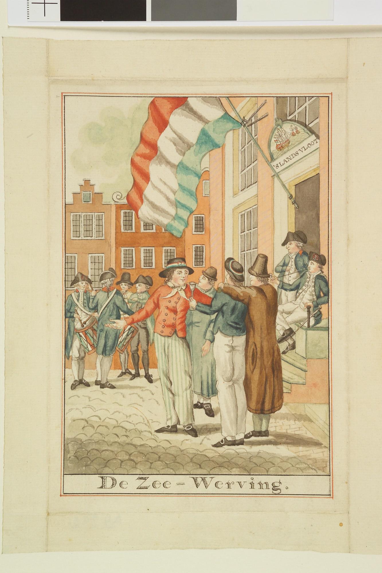 'De Zee-werving.' Een wervingskantoor voor de oorlogsvloot, met een aantal mannen ervoor. Op straat staat een ronselaar, herkenbaar aan het rode baadje en lange witte broek, die drie mannen tracht te ronselen; op de trap van het inschrijvingsbureau zit een officier en een schrijver. Ontwerp voor de geïllustreerde uitgave uit 1792 van de 'Economische Liedjes' ...