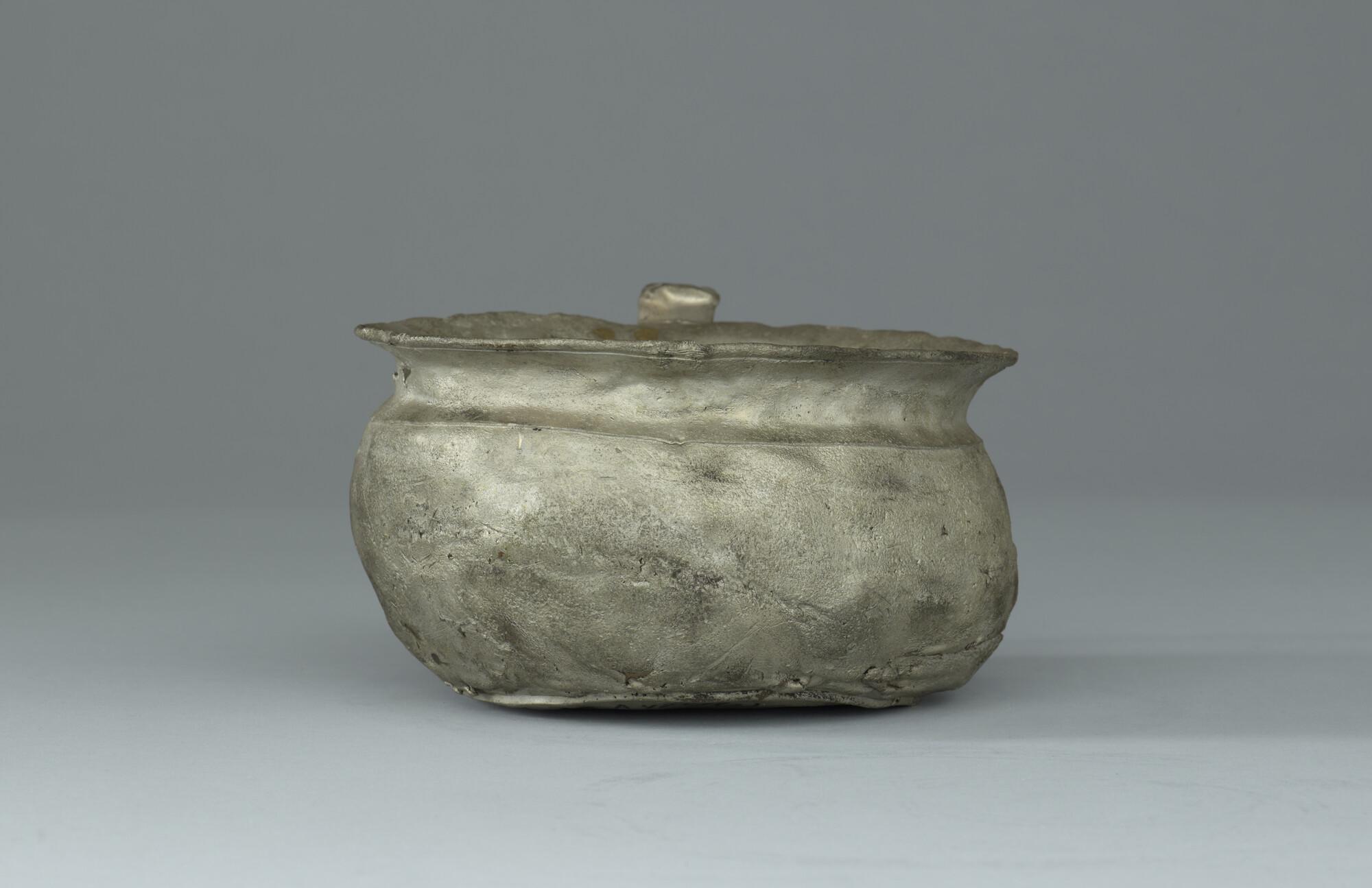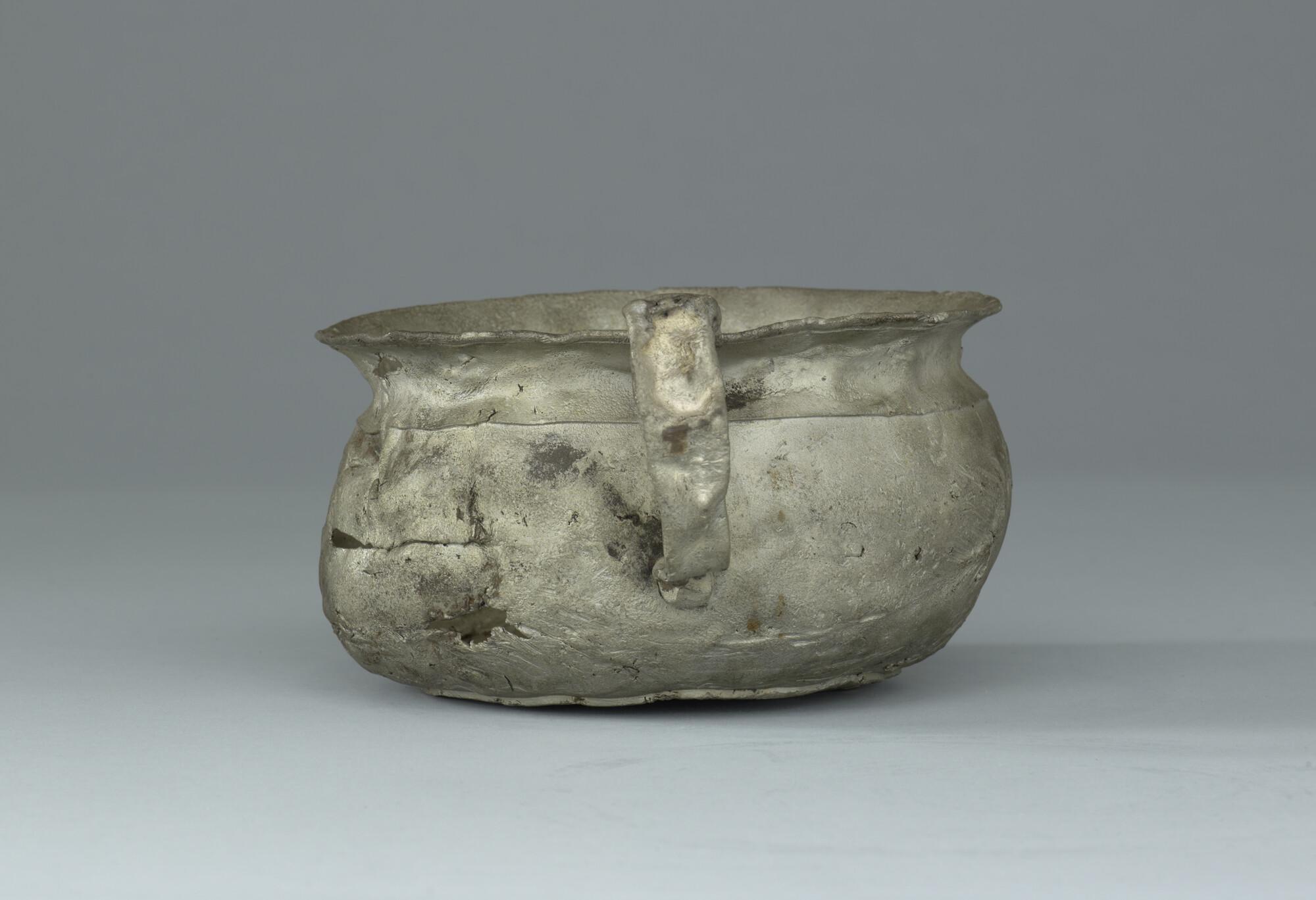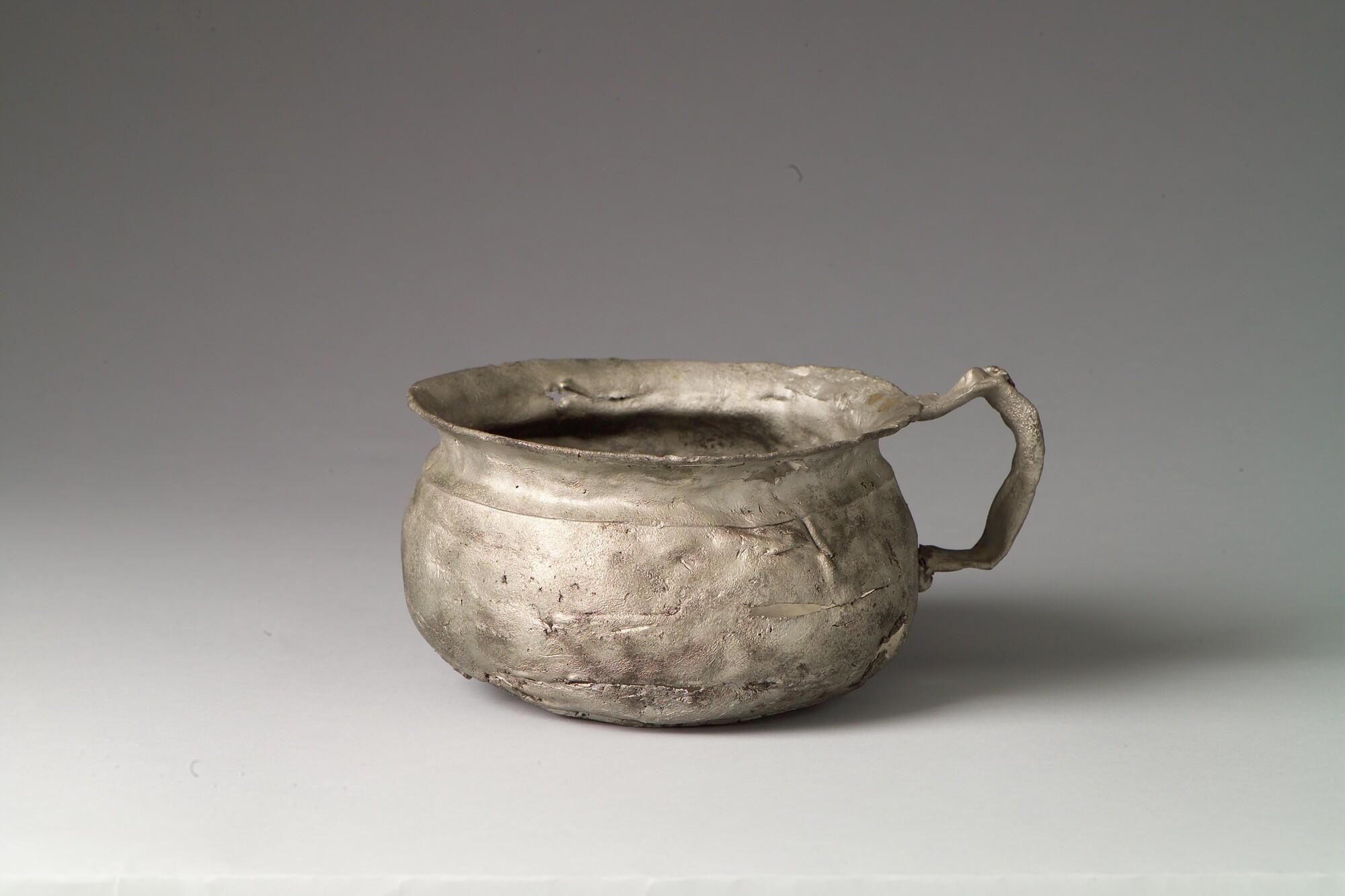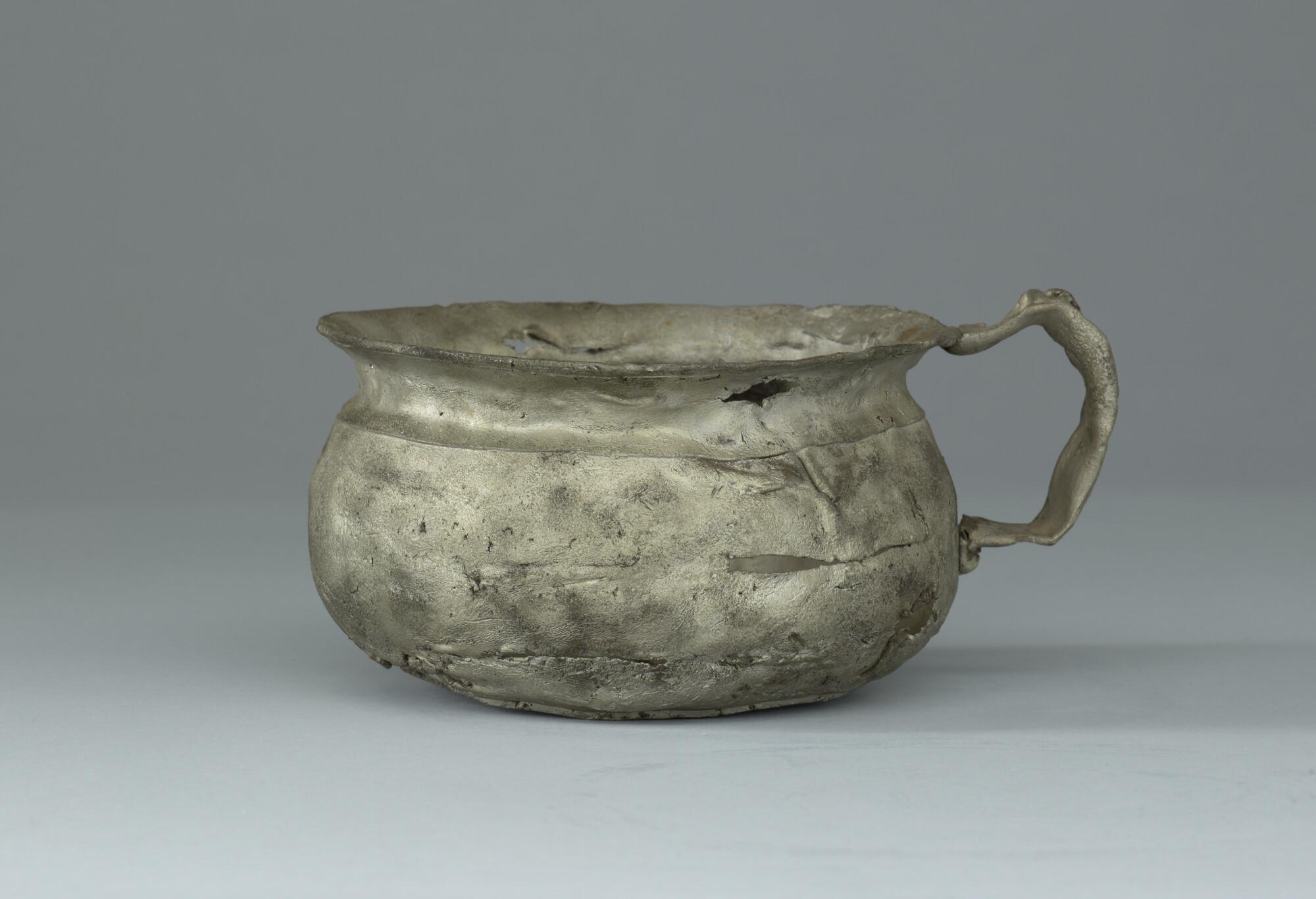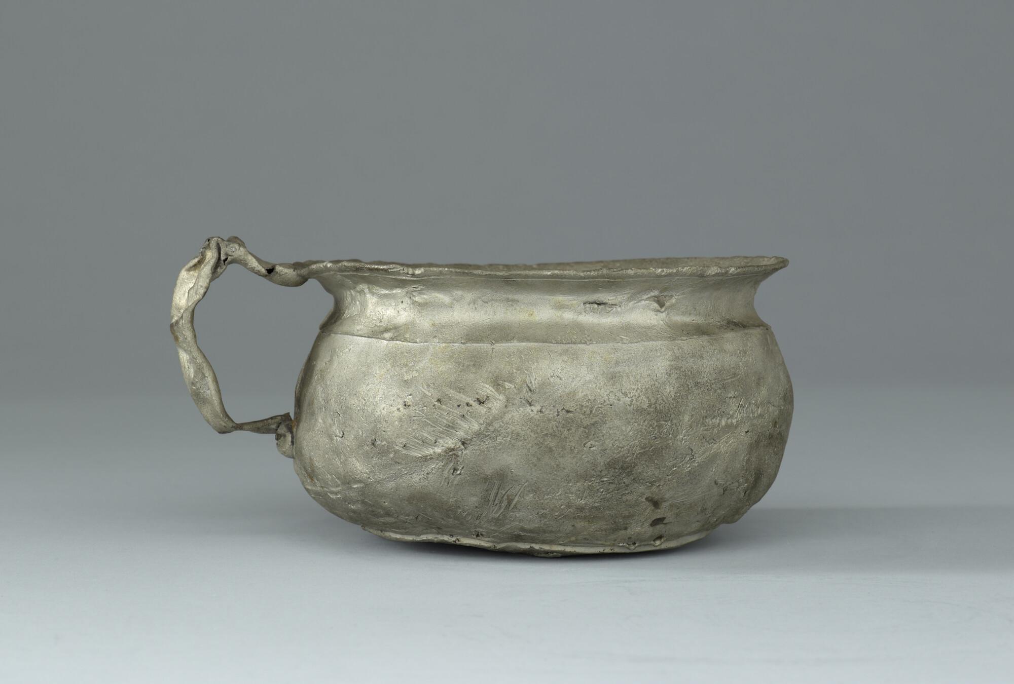 Po van tin met omgeslagen rand en greep. Amsterdamse tinmerken en gietersmerk. Afkomstig uit het wrak van de 'Hollandia', vergaan in 1743
