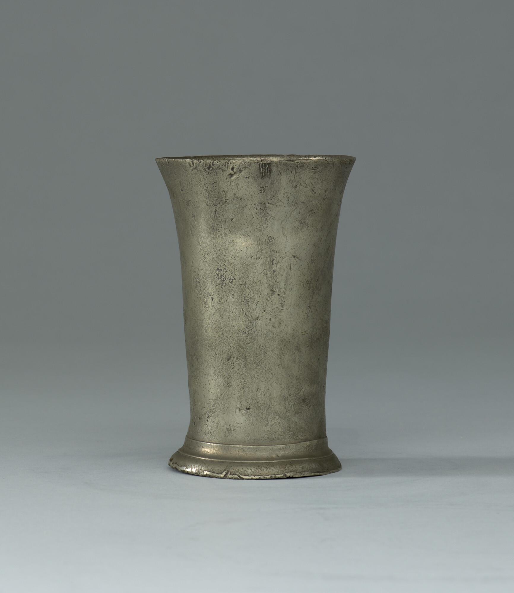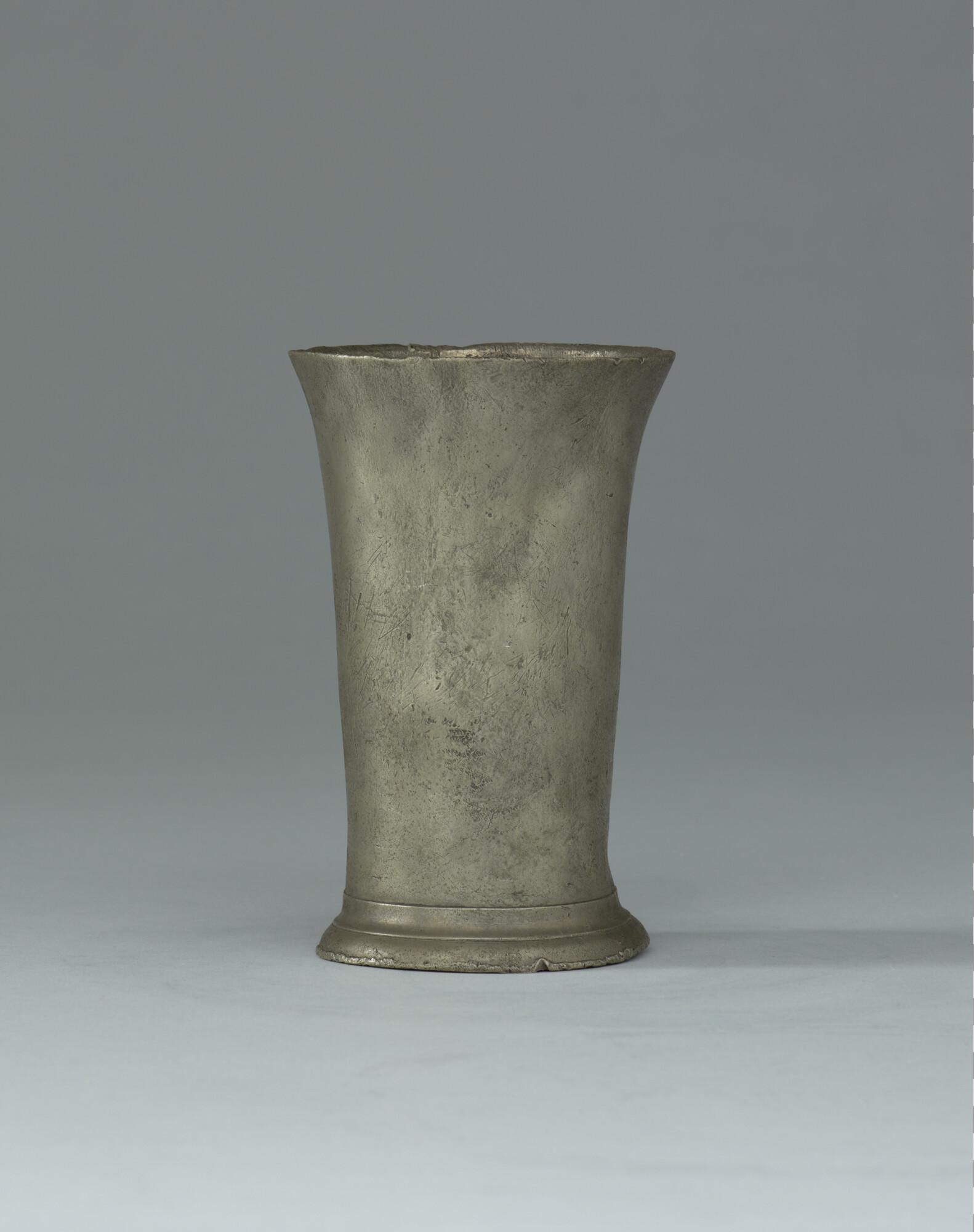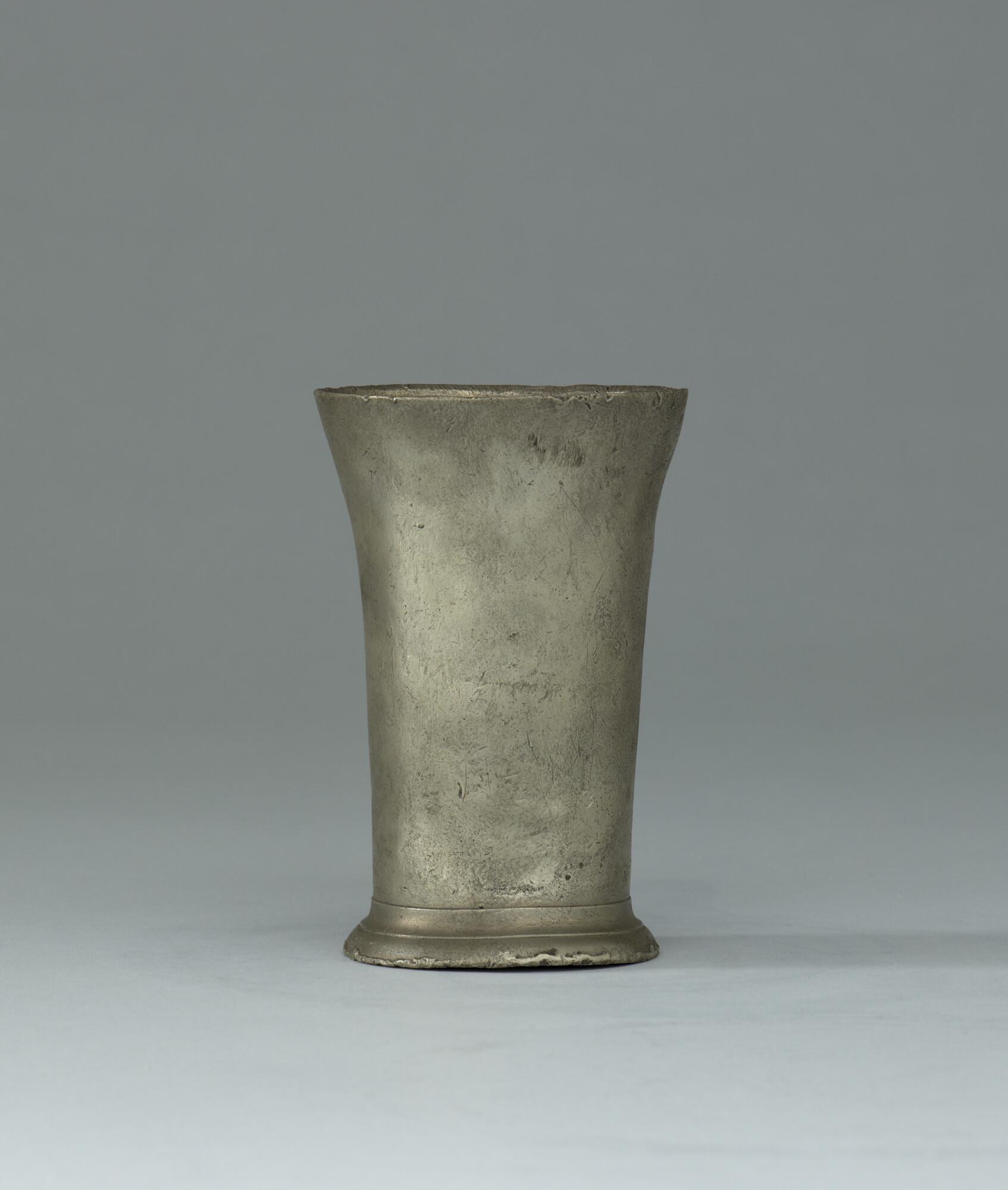 Conische tinnen beker op standring. VOC-stempel en gietersmerk boven een roos, afkomstig uit het wrak van de 'Hollandia", gezonken in 1743