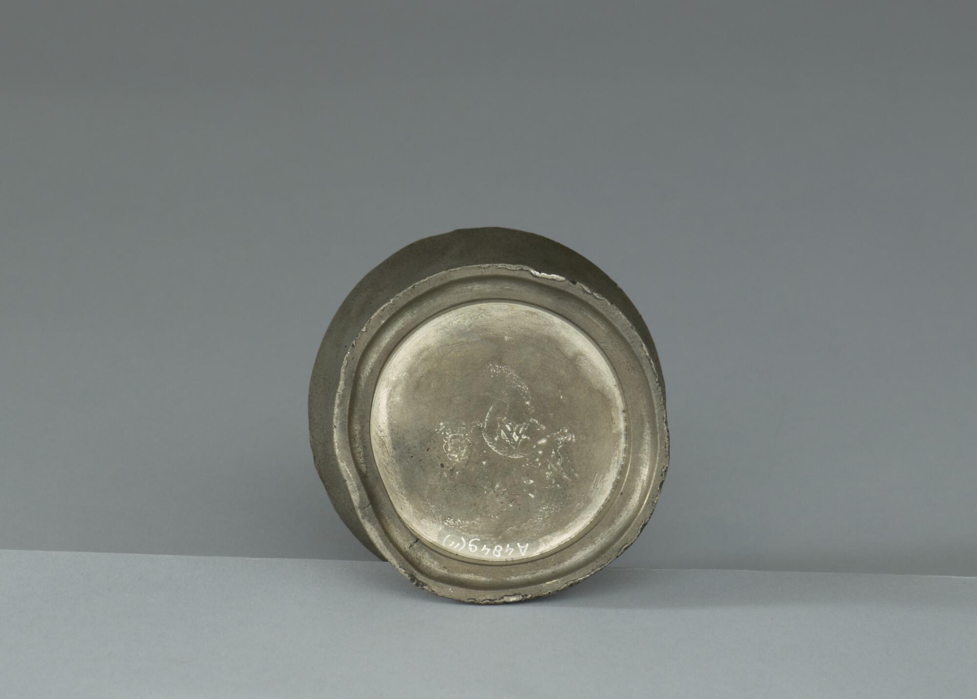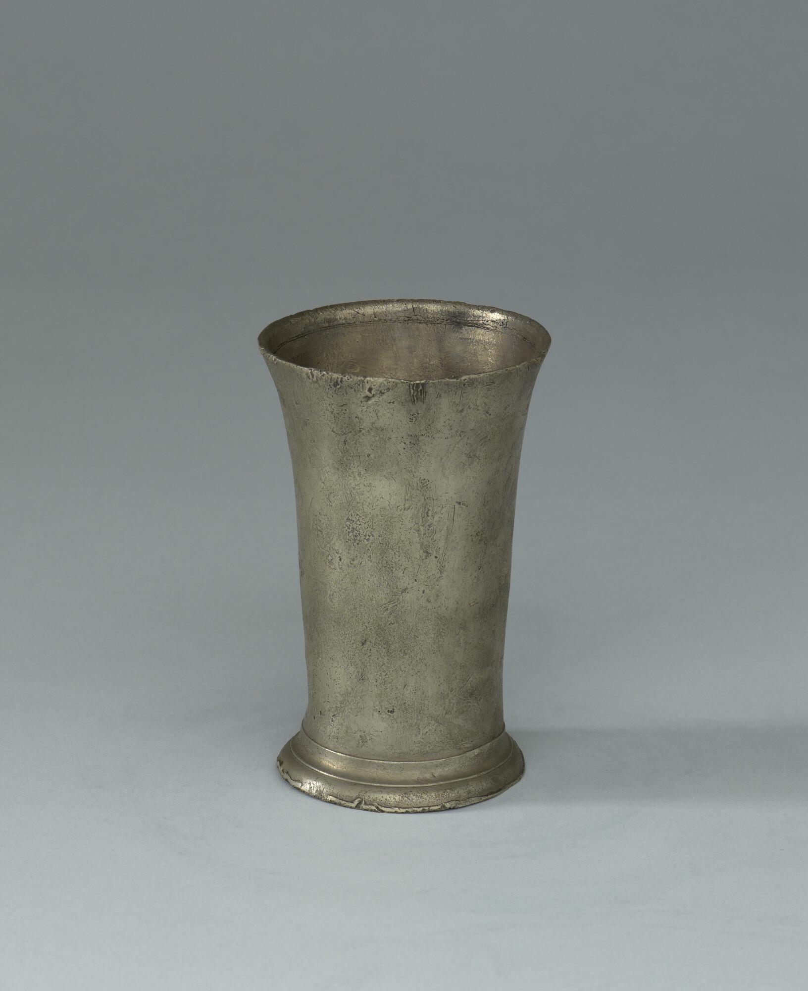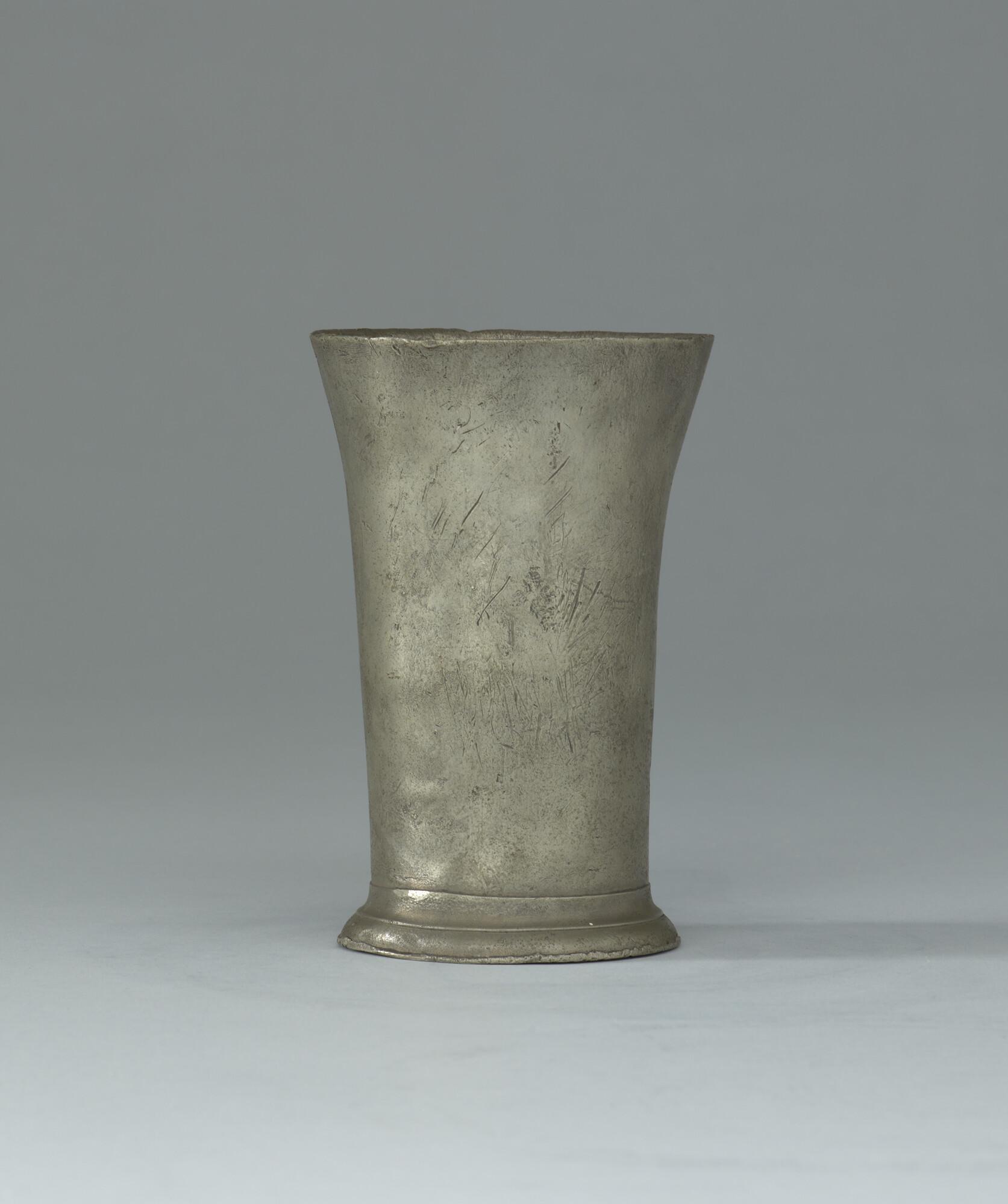 Conische tinnen beker op standring. VOC-stempel en gietersmerk boven een roos, afkomstig uit het wrak van de 'Hollandia", gezonken in 1743